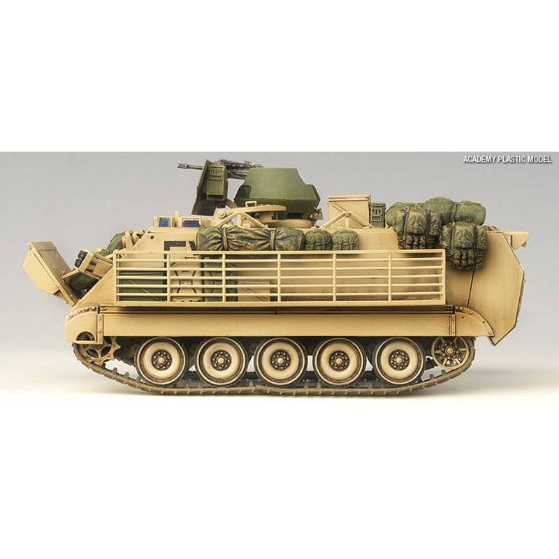 Le M113 est un véhicule blindé de transport de troupes américain. Les premiers modèles ont été créés en 1956 et la production en série chez FMC a commencé en 1960. Elle dura jusqu'en 1987 et aboutit à la production de 73 000 exemplaires de ce véhicule pour les besoins propres de l'US Army ainsi que pour l'exportation. Le M113 est entré en service dans pas moins de 45 pays, dont Israël, Espagne, Italie, Grèce et Allemagne. Le M113 est le moyen de transport le plus populaire au monde et constitue la base de la plus grande famille de véhicules blindés au monde. La coque du M113 est construite en acier et en aluminium, avec un blindage soudé. Cela réduit le poids, mais protège l'équipage uniquement contre les munitions de petit calibre. L'armée israélienne utilise l'armure Rafael TOGA pour corriger cette lacune. Le poste de conduite est situé à l'avant gauche et le moteur à l'avant droit du véhicule. Les soldats du débarquement (jusqu'à 7 personnes) sont assis sur des bancs le long de la coque et commencent le combat via la rampe située à l'arrière du transporteur, qui est abaissée hydrauliquement. Le M113 de base est capable de surmonter les obstacles d'eau, entraînés par des chenilles. Le M113 a été impliqué dans un très grand nombre de conflits entre autres. dans la guerre du Vietnam , dans la guerre du Yom Kippour , dans l' opération Desert Storm et dans la guerre d'Irak de 2003 . Dans l'armée américaine, elle est systématiquement remplacée par la voiture M2 Bradley. Parmi la grande famille basée sur le châssis M113, on peut citer le M901 américain, qui est armé d'un lanceur TOW, ou le M113 Fitter israélien avec une grue spéciale montée, qui est le véhicule de base des services israéliens de réparation et de réparation en blindé bataillons. Fitter est également utilisé par l'Australie et la Belgique. Données techniques (version M113A3) : longueur : 4.86m, largeur : 2.69m, hauteur : 2.54m, poids 12.1t, puissance moteur : 266KM, vitesse (sur route) : 66km/h, armement : 1 mitrailleuse calibre 12.7mm .
