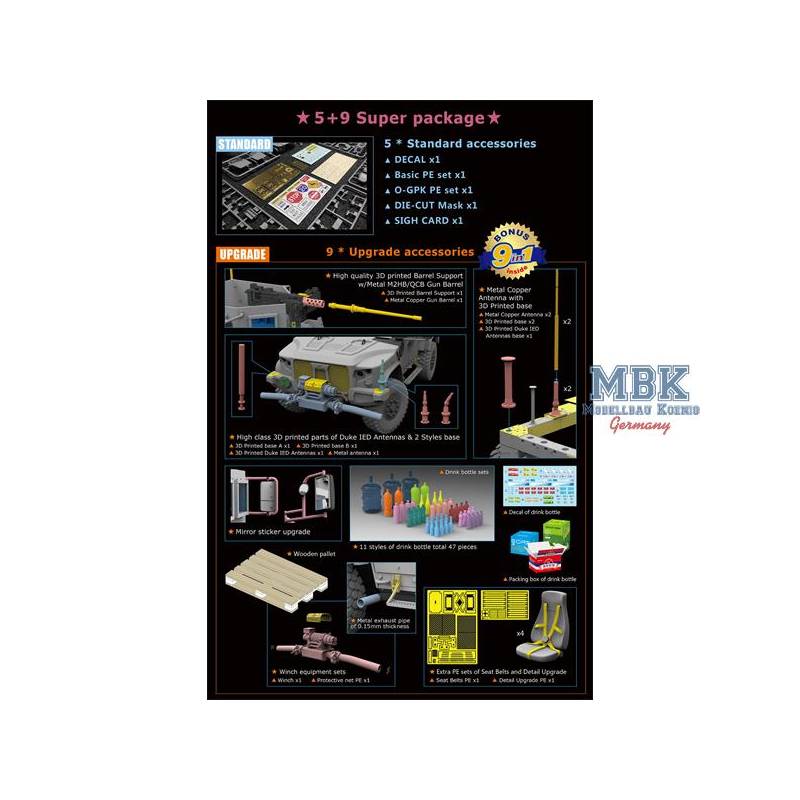 La finesse de gravure restitue parfaitement les surfaces blindées du JLTV, la géométrie anguleuse de la caisse, l’épaisseur réaliste des vitrages et la complexité de la plateforme d’armement. Les pneus à déformation de la version Deluxe apportent un réalisme visuel impressionnant en situation de charge. La mitrailleuse M2 est reproduite avec culasse, poignée, affût et alimentation détaillés.
