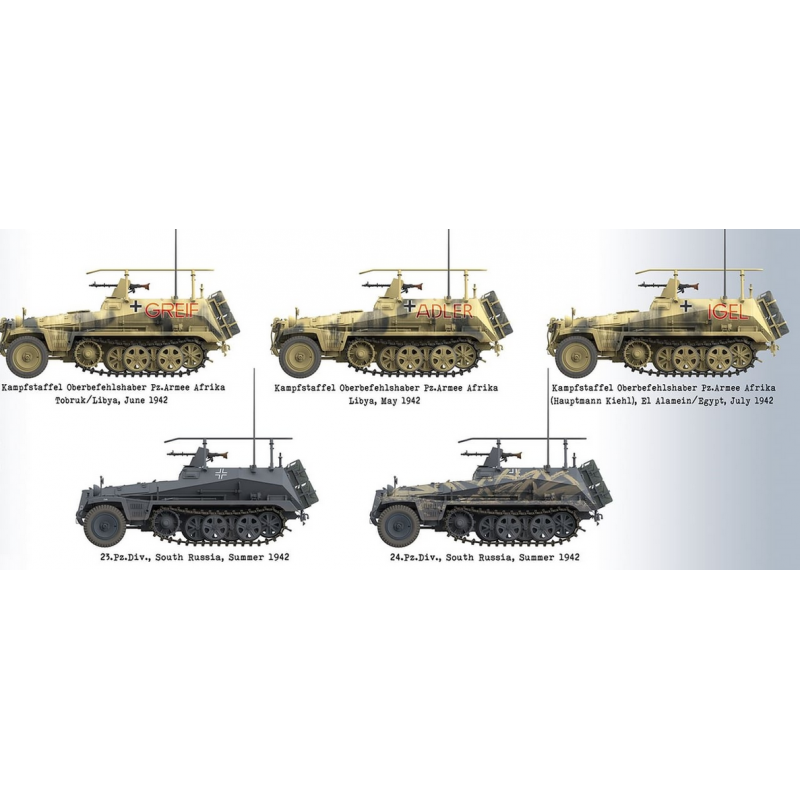 Le kit inclut également deux figurines à l’échelle, représentant un conducteur et le maréchal Erwin Rommel. Ces figurines permettent de réaliser une scène de commandement réaliste, notamment dans un contexte africain où ce véhicule est particulièrement connu. Cinq décorations différentes sont proposées, permettant de représenter plusieurs véhicules historiques sur différents fronts.