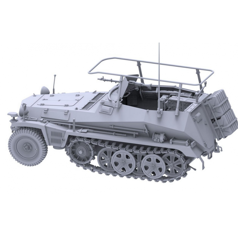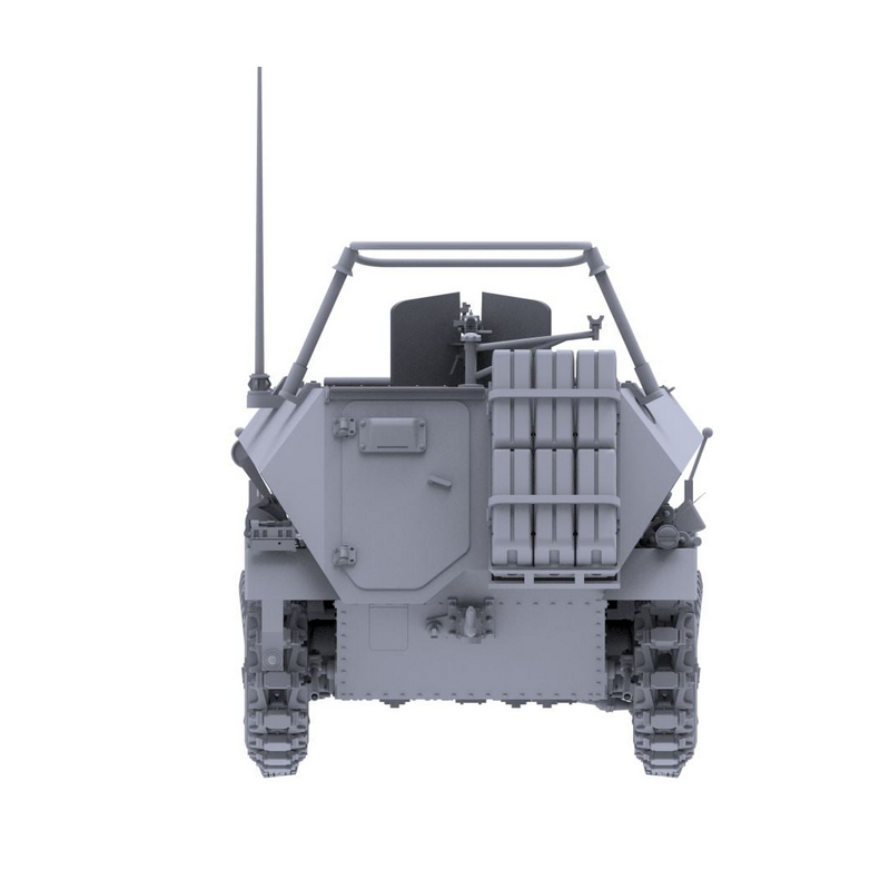 Le train de roulement est fidèlement reproduit avec suspension à barres de torsion comme sur le véhicule réel. Les chenilles sont fonctionnelles et permettent d’obtenir un aspect réaliste ainsi qu’un montage fidèle du système semi-chenillé. Les roues directrices avant et les éléments de suspension sont finement détaillés, renforçant l’authenticité du modèle.
