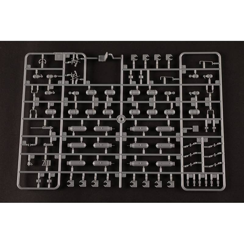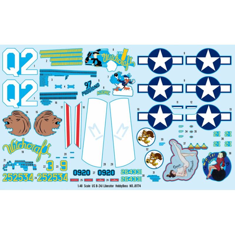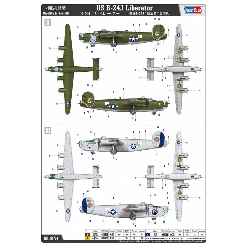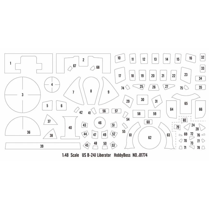 La version B-24J, représentée ici par Hobby Boss, fut l’une des plus produites. Elle introduisait une tourelle Emerson motorisée à l’avant, remplaçant la position de nez vitrée, améliorant ainsi la défense contre les attaques frontales. Comme ses homologues, il était armé de dix mitrailleuses Browning M2 de calibre .50 réparties dans le nez, les tourelles dorsale et ventrale, la queue et les positions latérales, garantissant une couverture défensive quasi complète.