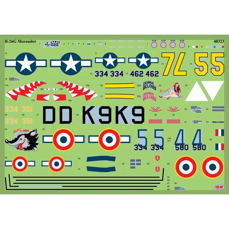 Ce kit à l’échelle 1/48 reproduit fidèlement le B-26G avec un haut niveau de détail. Une fois assemblé, le modèle présente une longueur de trois cent quatre-vingt-sept millimètres pour une envergure de quatre cent cinquante-trois millimètres. La boîte mesure quatre cent dix millimètres par deux cent soixante millimètres et cinquante-cinq millimètres de hauteur. Le kit comprend trois cent quatre-vingts pièces et propose plusieurs options de marquage, dont un appareil du 494th Bombardment Squadron en 1944, le B-26G-5-MA portant les noms Margie et Donna Deloris du 444th Bombardment Squadron stationné en Sardaigne à l’automne 1944, ainsi qu’un exemplaire français du Groupement de Bombardement Moyen 1/32 Bourgogne en 1945. Ce modèle constitue un choix idéal pour les amateurs d’aviation militaire souhaitant recréer l’histoire du Marauder dans les forces alliées.