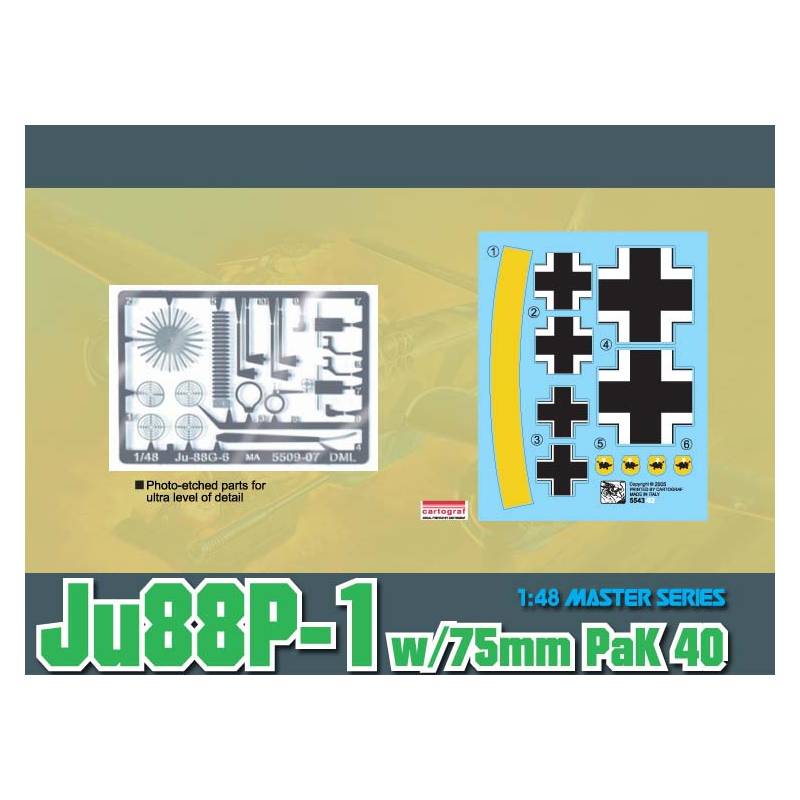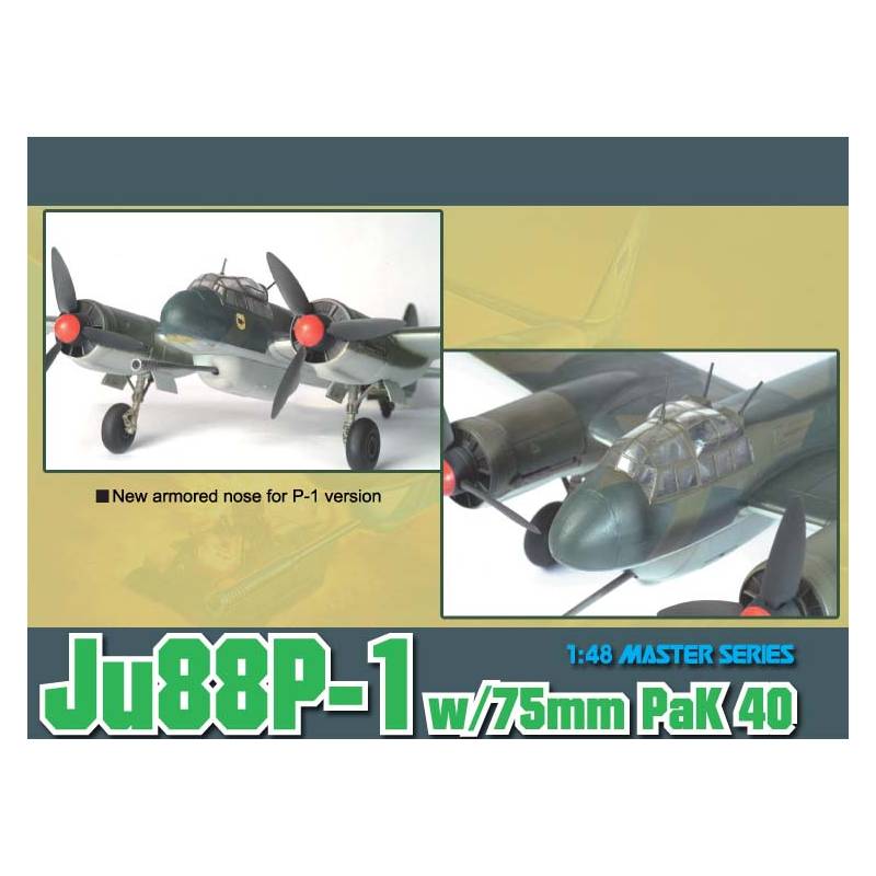 La maquette Junkers Ju 88 P-1 "Tank Buster" proposée par Dragon à l’échelle 1/48 (réf. 5543) restitue l’une des variantes les plus insolites et expérimentales du célèbre bimoteur allemand. Le Ju 88, produit à plus de 15 000 exemplaires durant la Seconde Guerre mondiale, fut l’avion multirôle par excellence de la Luftwaffe : bombardier, chasseur de nuit, torpilleur, éclaireur, il occupa une multitude de fonctions. Mais face à la menace croissante des blindés soviétiques sur le front de l’Est, les ingénieurs tentèrent de transformer ce bombardier en chasseur de chars lourdement armé.
