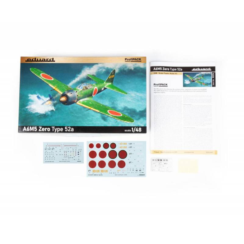La version A6M5 Type 52a, reproduite ici par Eduard, représente l’une des évolutions majeures de la série. Introduite à partir de mars 1944, elle marquait un effort de modernisation du chasseur face à la supériorité croissante des appareils américains tels que le F6F Hellcat et le F4U Corsair. Le modèle 52a se distinguait par un revêtement d’aile plus épais, des saumons d’ailes raccourcis et fixés, ainsi qu’un système d’échappement individuel augmentant la poussée. Bien que légèrement plus lourd, il atteignait 565 km/h en palier et jusqu’à 740 km/h en piqué, améliorant considérablement la résistance structurelle et la vitesse maximale par rapport aux modèles antérieurs.