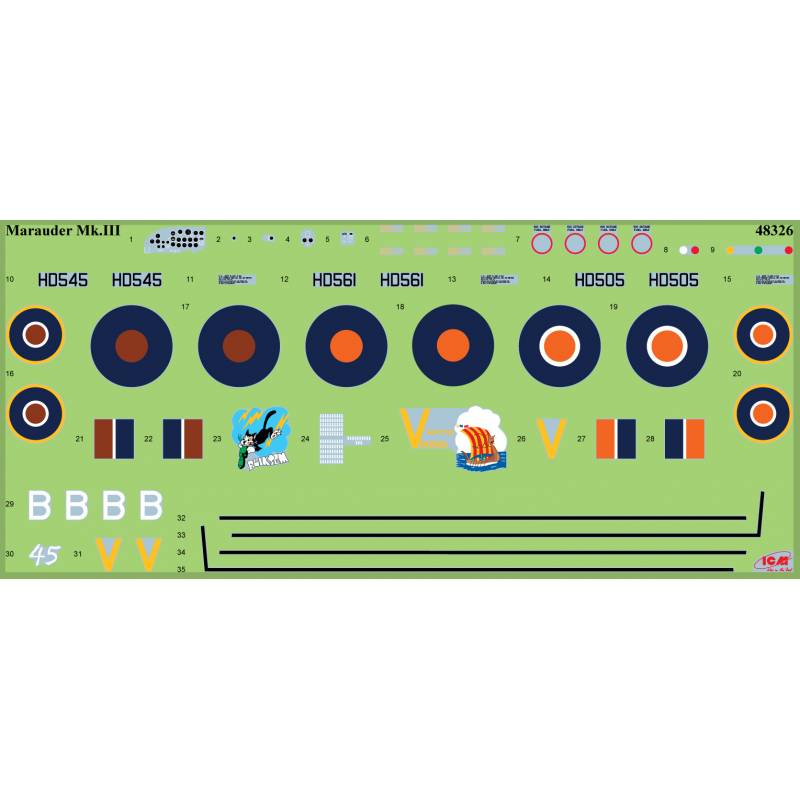 Maquette ICM 1/48 du Marauder Mk.III RAF/SAAF, version britannique du B-26F. Détails précis, cockpit complet, 3 décorations, 380 pièces, gravure fine.