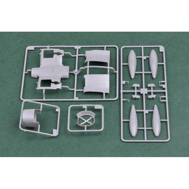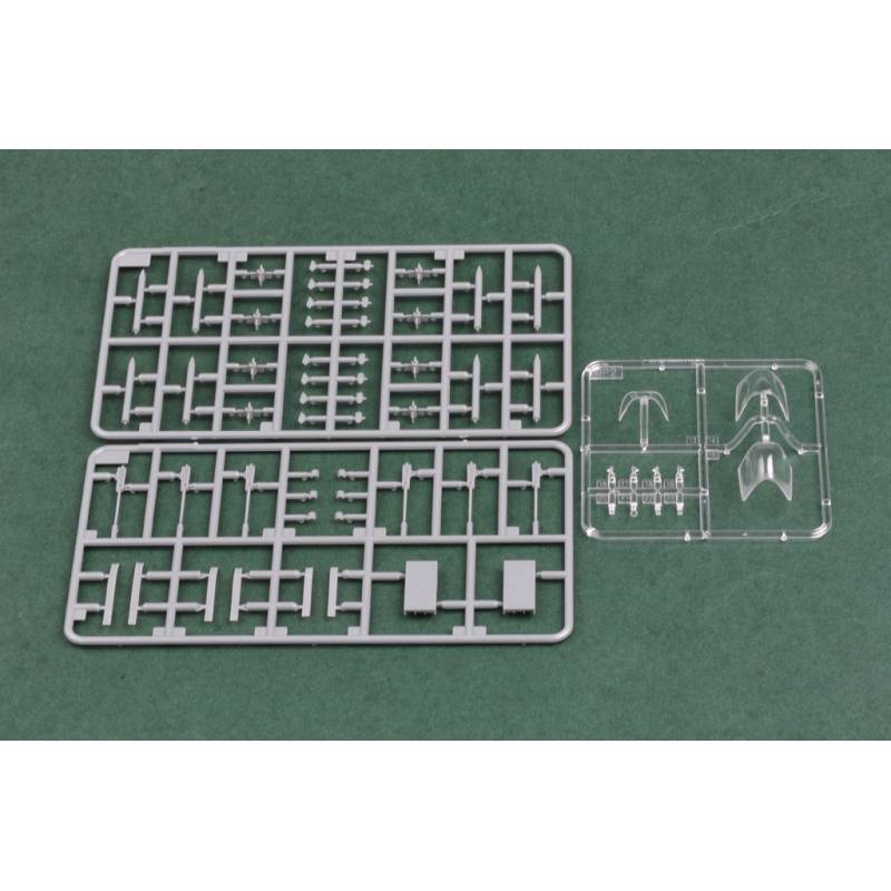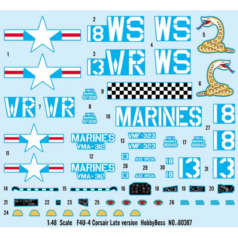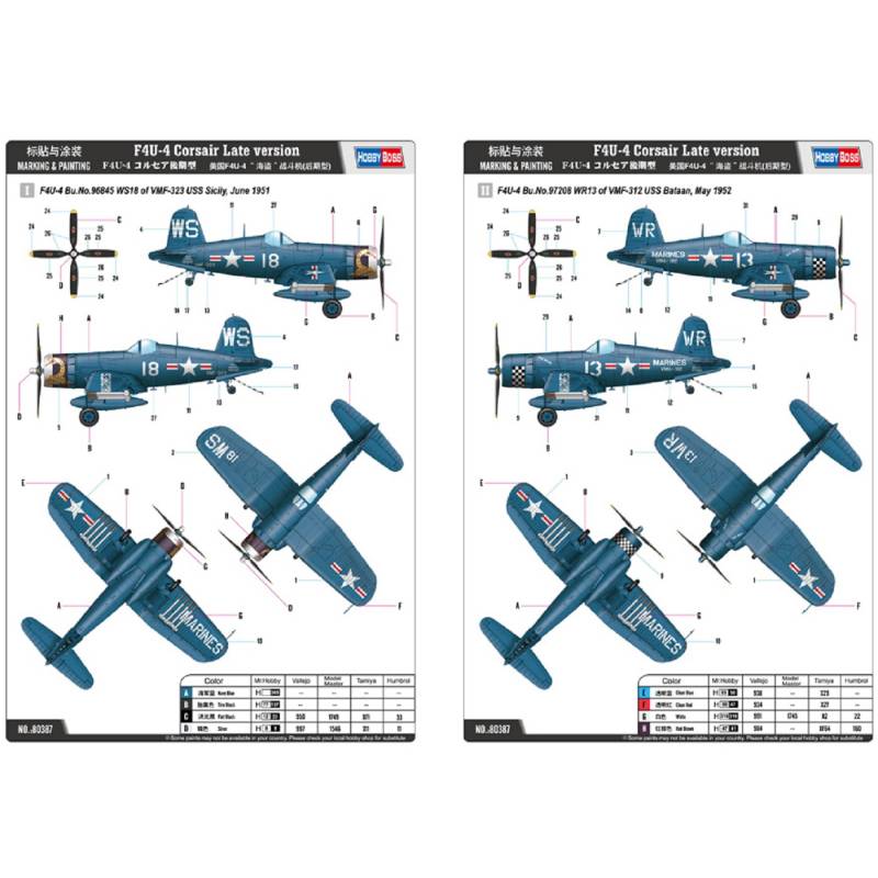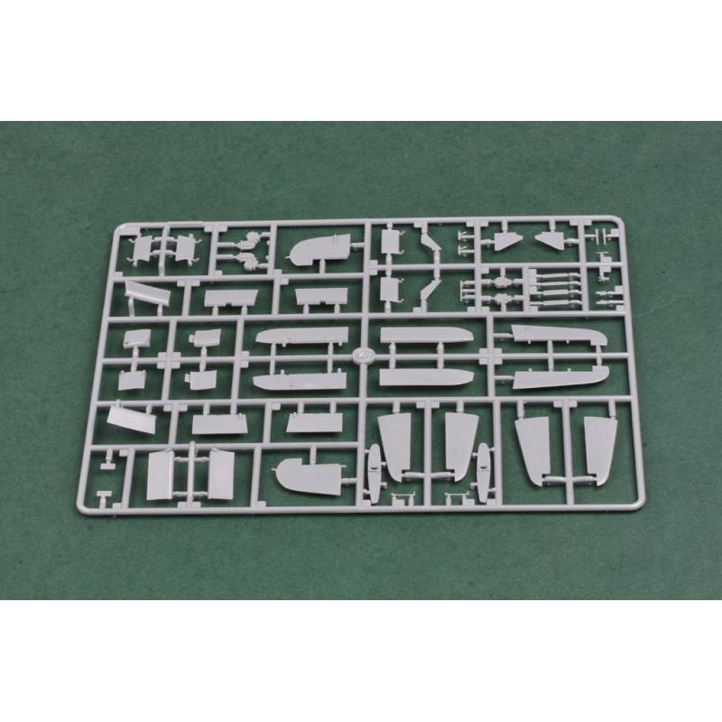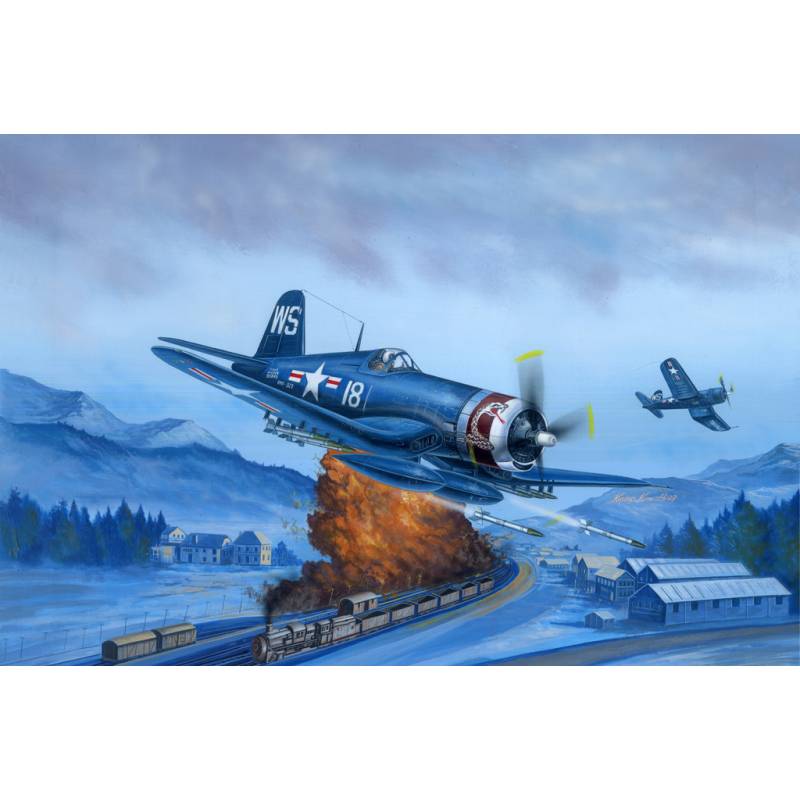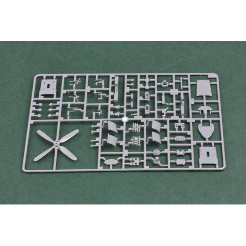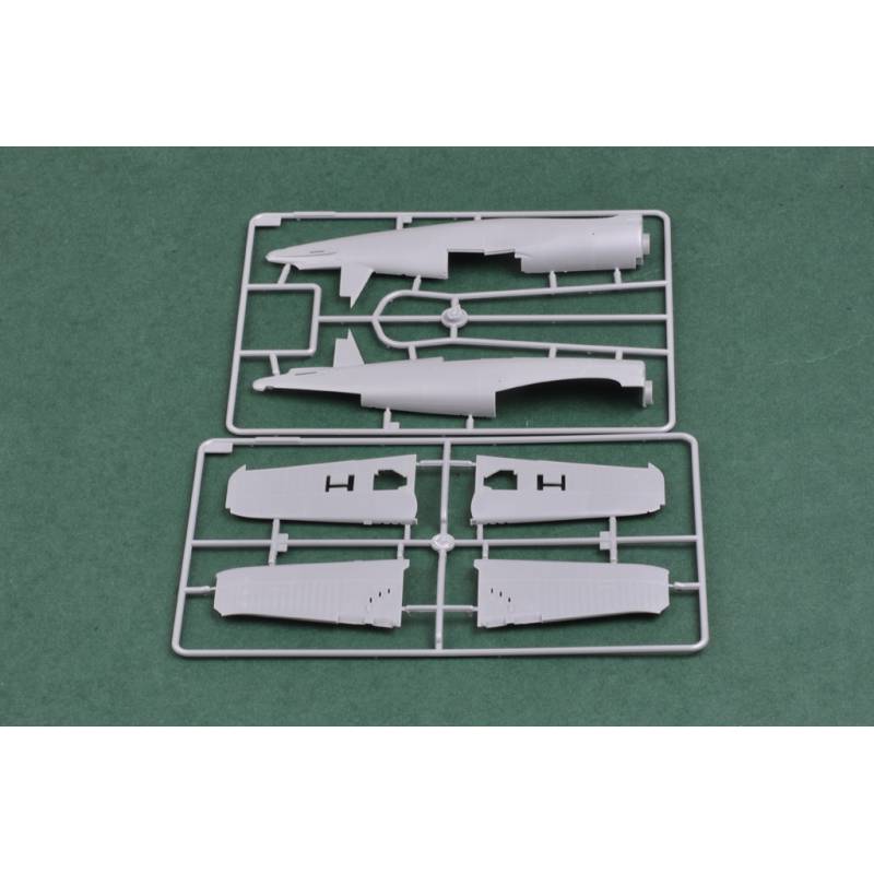 Le kit Hobby Boss offre une reproduction détaillée et accessible de cet appareil emblématique. Il comprend plus de 300 pièces réparties sur 12 grappes, ainsi que des éléments transparents permettant de reproduire fidèlement la verrière. Le fuselage et les ailes présentent des formes précises avec une gravure fine des panneaux, tandis que le moteur radial est correctement détaillé pour offrir un rendu réaliste une fois monté. Le logement du train d’atterrissage est également reproduit avec soin, apportant de la profondeur au modèle. La décoration proposée correspond à un appareil de l’US Navy en fin de conflit.