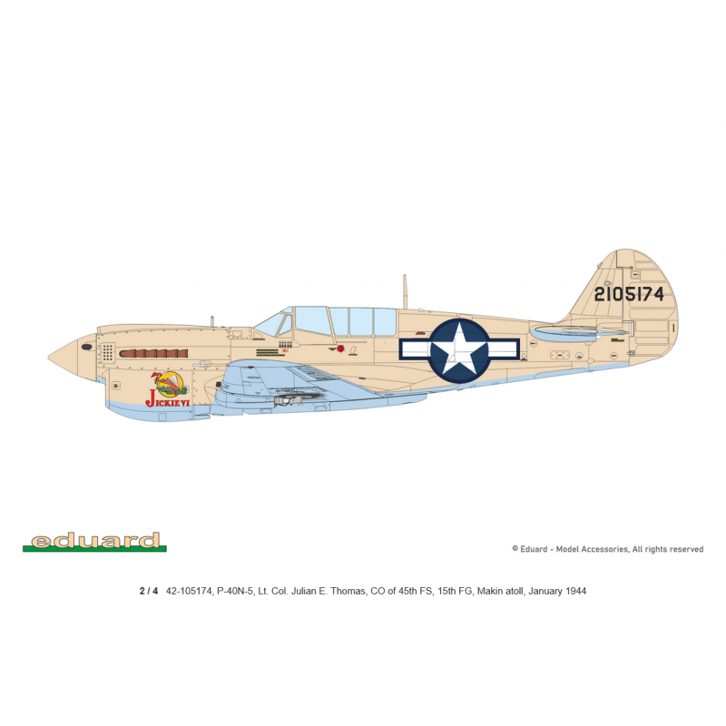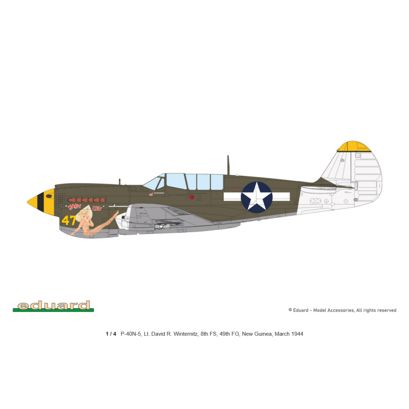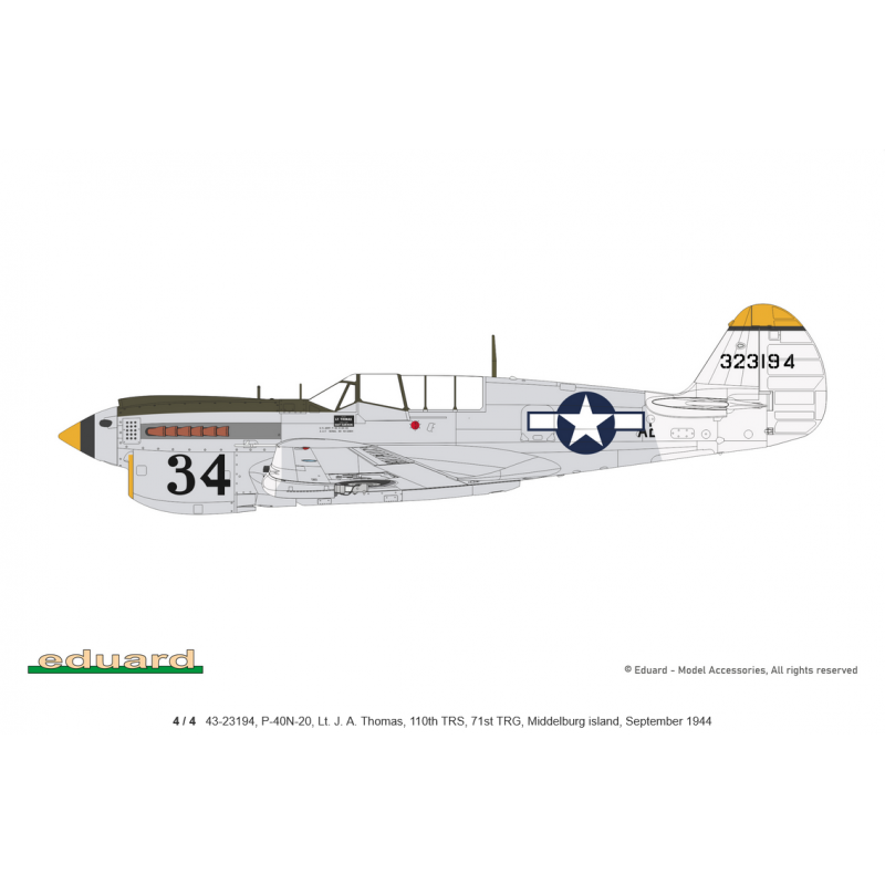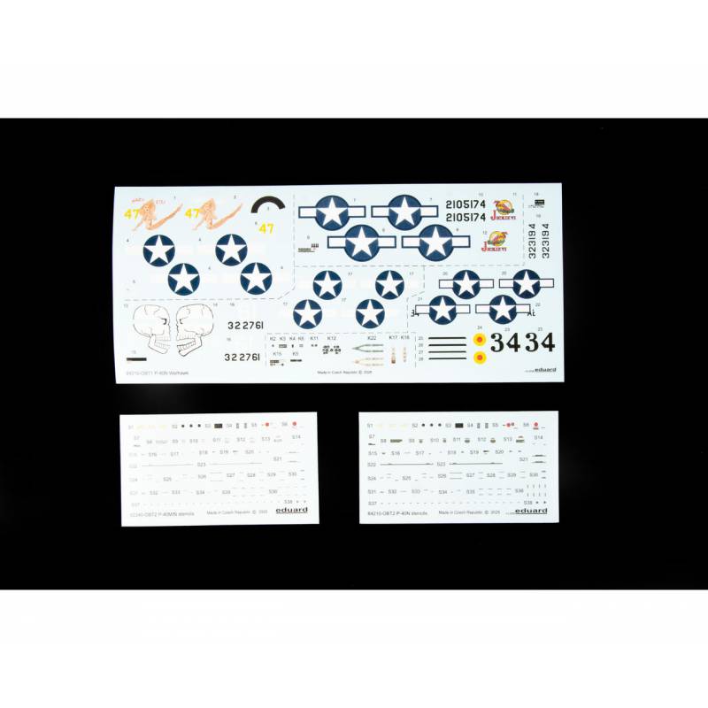 Le coffret propose 4 décorations différentes, permettant de représenter plusieurs appareils opérationnels avec des livrées variées, typiques des théâtres d’opérations du P-40. Les décalques Eduard assurent finesse et précision pour un rendu final de qualité.