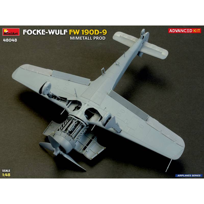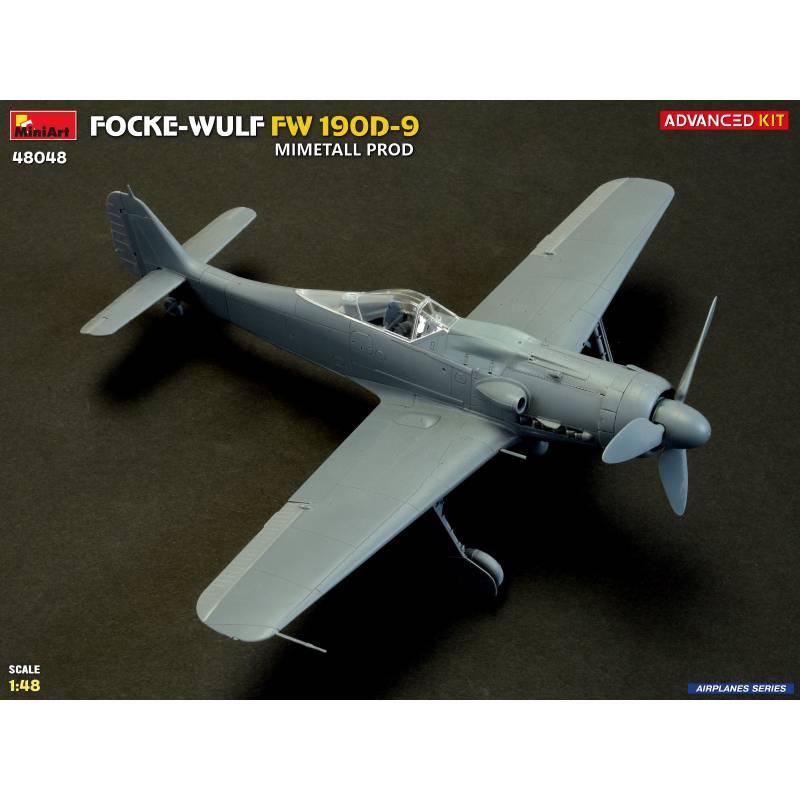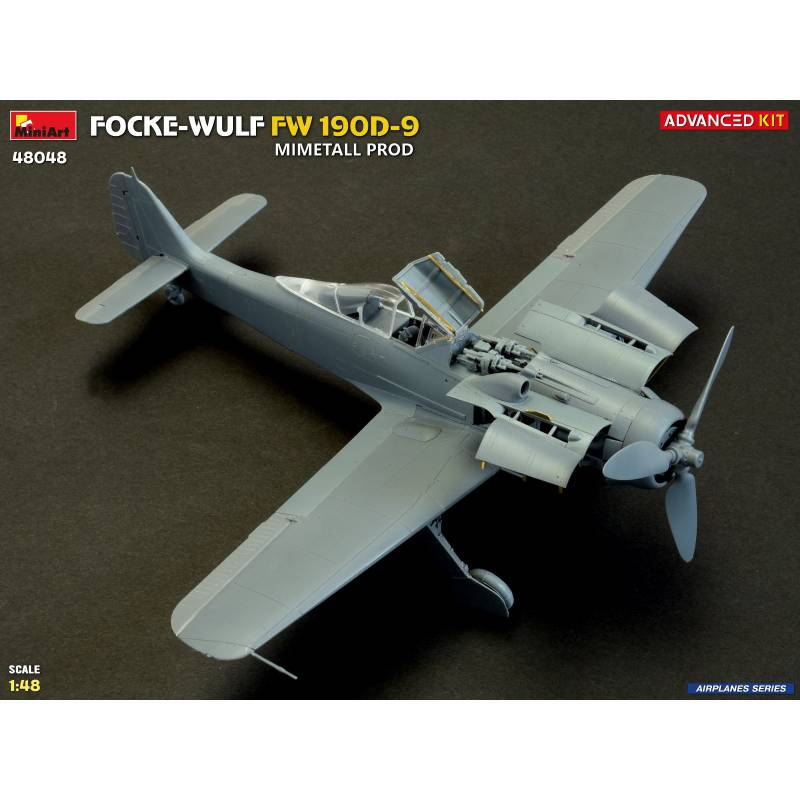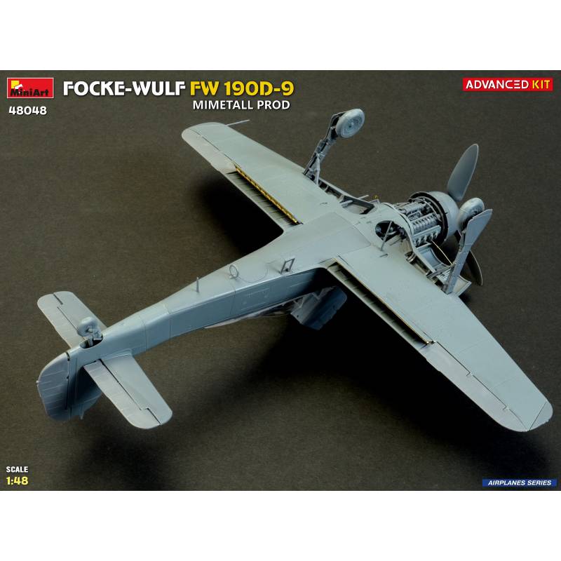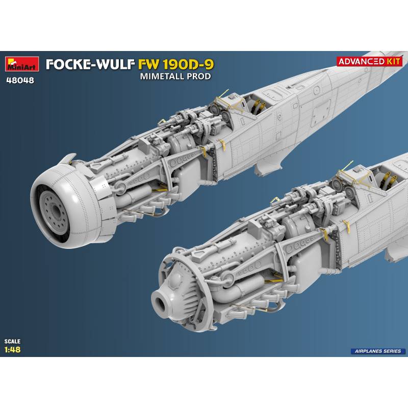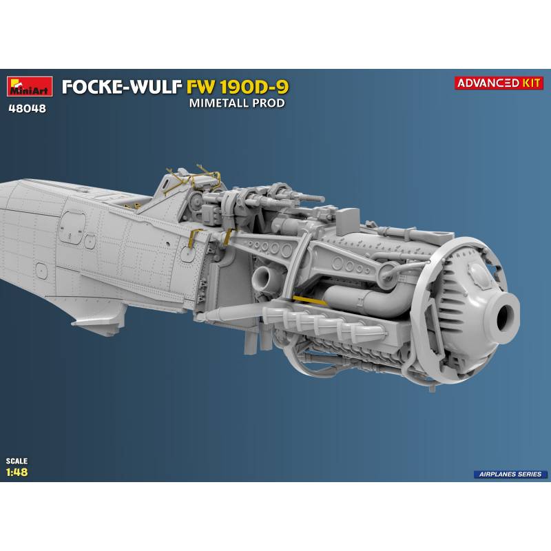 La maquette MiniArt réf. 48048 à l’échelle 1:48 est proposée en version “Advanced Kit”, destinée aux maquettistes expérimentés recherchant un haut niveau de détail. Le kit reproduit fidèlement les caractéristiques du Fw 190D-9 issu des chaînes de production Mimetall, avec une attention particulière portée aux détails spécifiques de cette version.