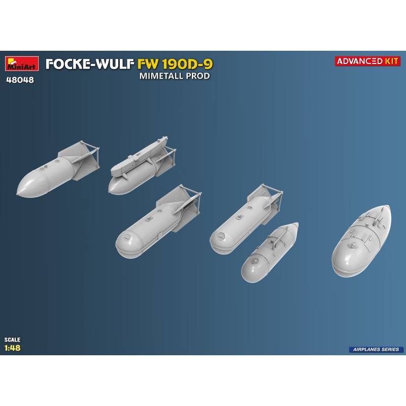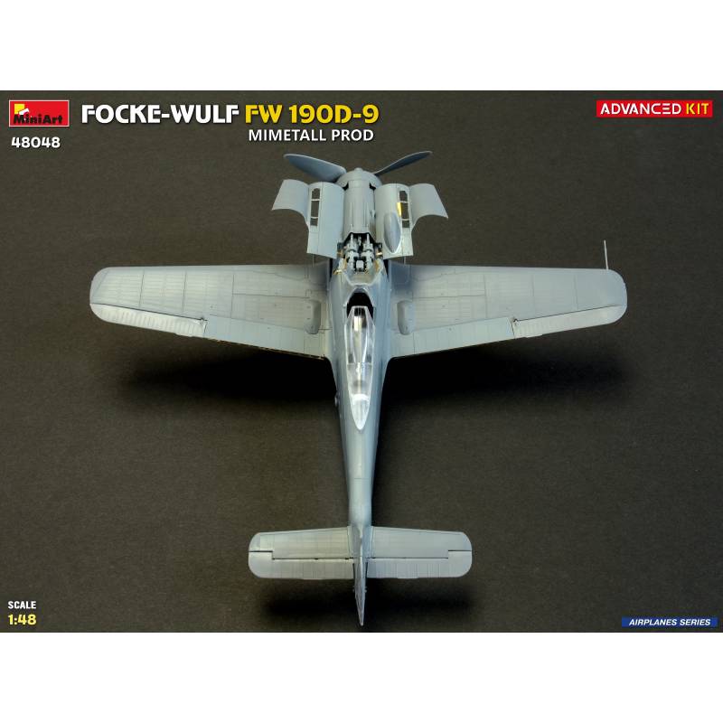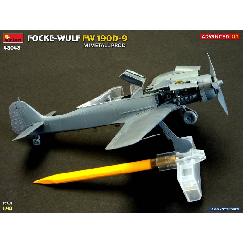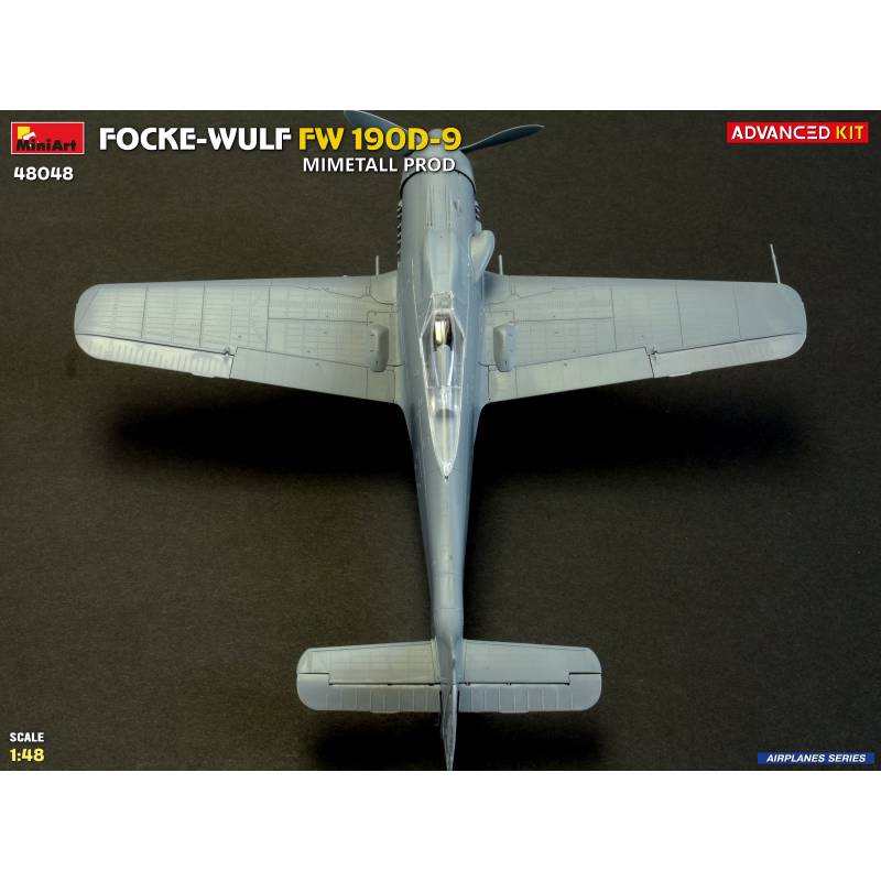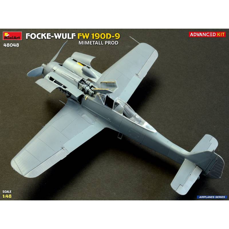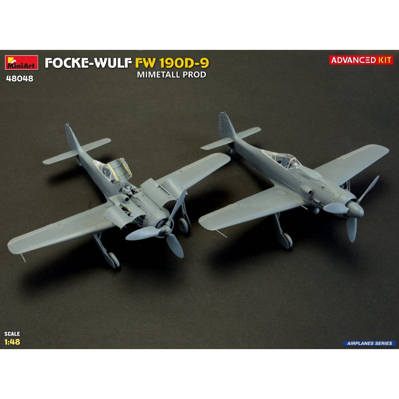 La maquette MiniArt réf. 48048 à l’échelle 1:48 est proposée en version “Advanced Kit”, destinée aux maquettistes expérimentés recherchant un haut niveau de détail. Le kit reproduit fidèlement les caractéristiques du Fw 190D-9 issu des chaînes de production Mimetall, avec une attention particulière portée aux détails spécifiques de cette version.