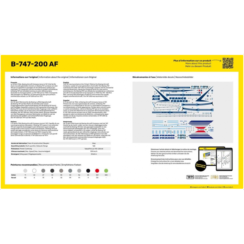 La maquette du Boeing 747-200 Heller au 1:125 est un hommage à l'un des avions les plus iconiques de l'aviation commerciale. En raison de sa taille, de son niveau de détail et de la possibilité de recréer la livrée d'Air France, ce kit est un choix incontournable pour les amateurs d'aviation civile. Sa construction demande un peu de patience, mais le résultat final est impressionnant, offrant un modèle imposant et réaliste du célèbre "Jumbo Jet".