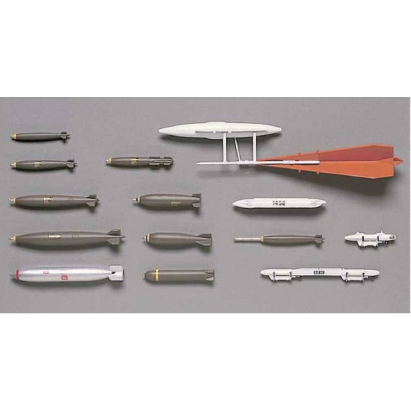 Ce set Hasegawa au 1/48 propose une sélection complète de bombes américaines classiques ainsi qu’un système de cible remorquée (Tow Target), permettant d’équiper avec réalisme les avions tactiques de l’US Air Force et de l’US Navy de l’après-guerre jusqu’aux premières décennies de l’ère moderne. Il constitue un complément indispensable pour enrichir des modèles tels que F-4 Phantom II, F-8 Crusader, A-4 Skyhawk, A-7 Corsair II, F-100, F-105, F-111 ou encore les premiers F-14 et F-15.
