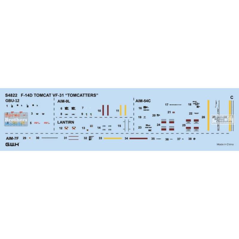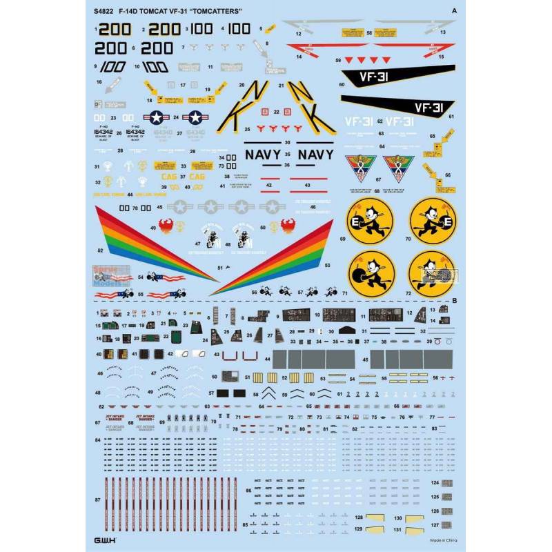 Le kit propose trois options de marquages, permettant de représenter différents appareils de la fin de carrière du F-14D, dont ceux du VF-31. Avec une longueur d’environ 39 cm pour l’appareil réel à cette échelle, le modèle monté offre une présence remarquable en vitrine et constitue une pièce centrale pour toute collection dédiée à l’aviation embarquée moderne.