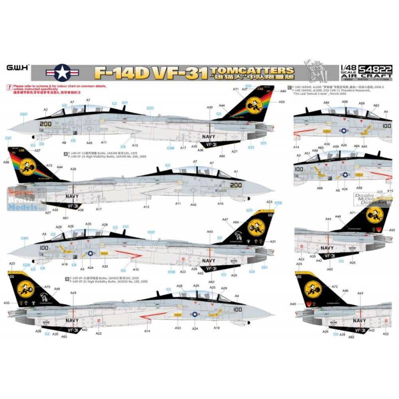 La version F-14D représente l’aboutissement de la lignée, avec une avionique modernisée, des capteurs améliorés et une fiabilité accrue. Elle est notamment motorisée par des turboréacteurs plus performants et bénéficie d’une électronique embarquée de dernière génération pour l’époque. Le célèbre escadron VF-31 Tomcatters, identifiable à son emblème du chat noir, fut l’un des derniers à opérer le Tomcat, notamment dans ses livrées haute visibilité de fin de carrière.