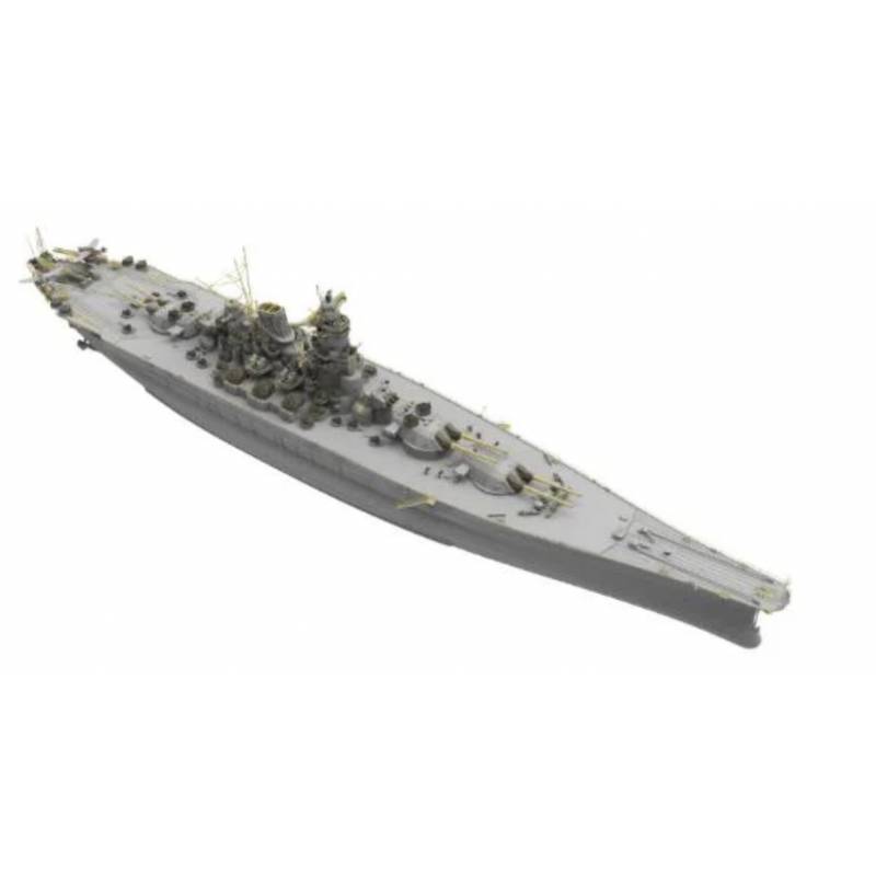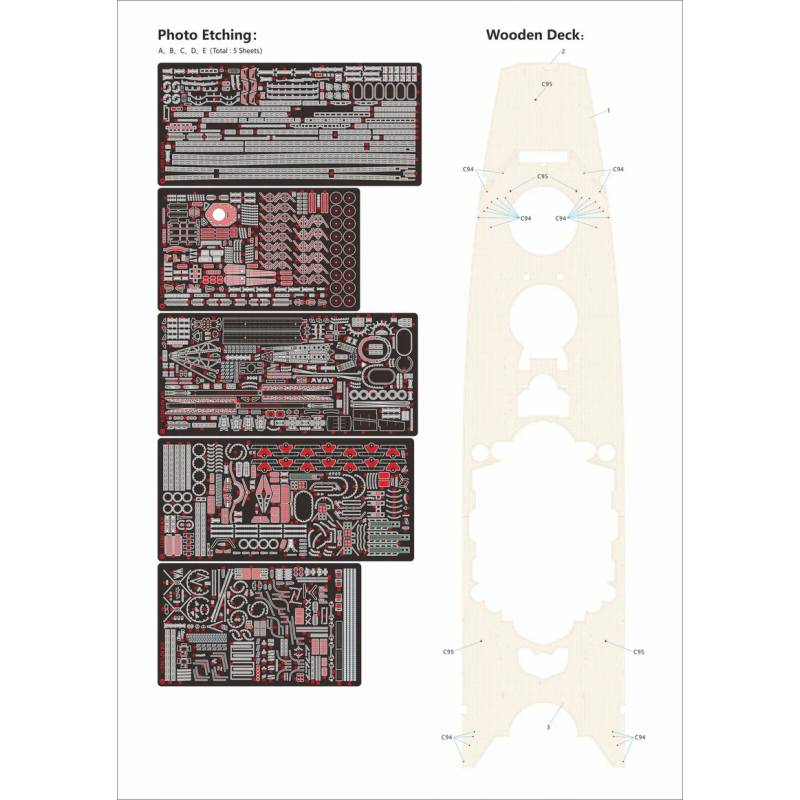 La maquette comprend une coque et des superstructures finement moulées, complétées par des planches de photodécoupe pour affiner les radars, rambardes, grues et équipements de pont. La boîte Deluxe inclut également des pièces en laiton tourné pour l’artillerie principale et secondaire, des éléments en résine pour certains détails complexes, ainsi qu’un pont en bois véritable permettant d’obtenir un rendu réaliste sans peinture complexe du pont principal. Une chaîne d’ancre métallique et des décalcomanies sont également fournies.