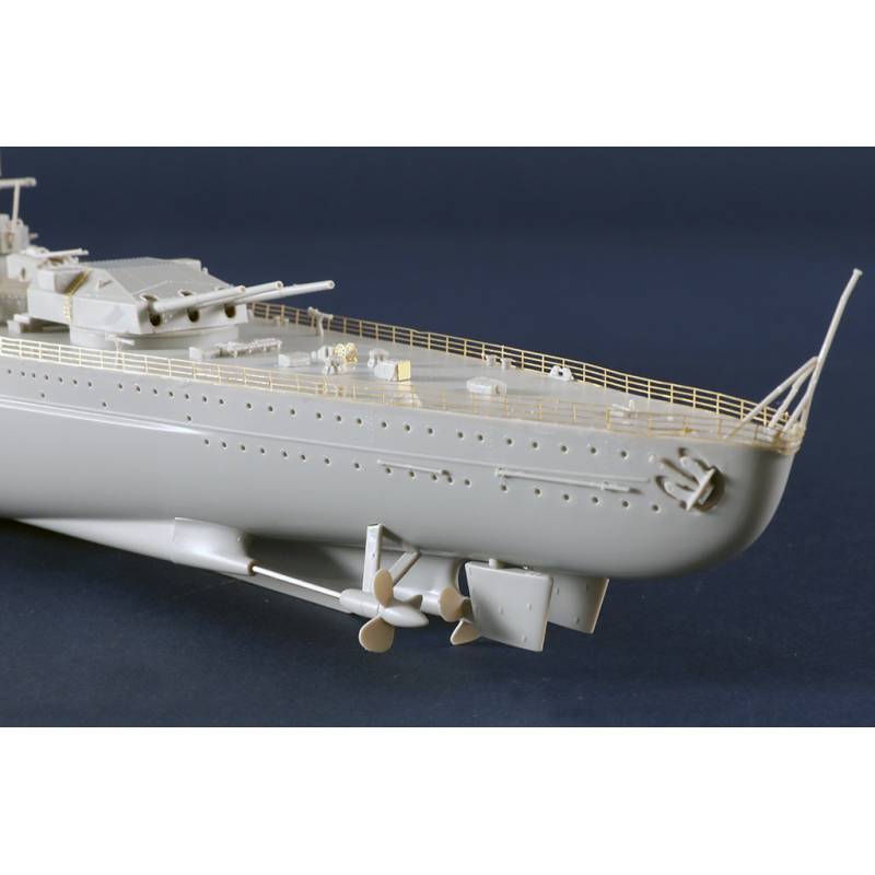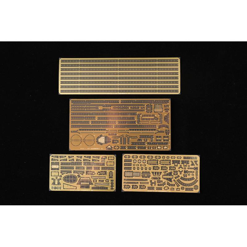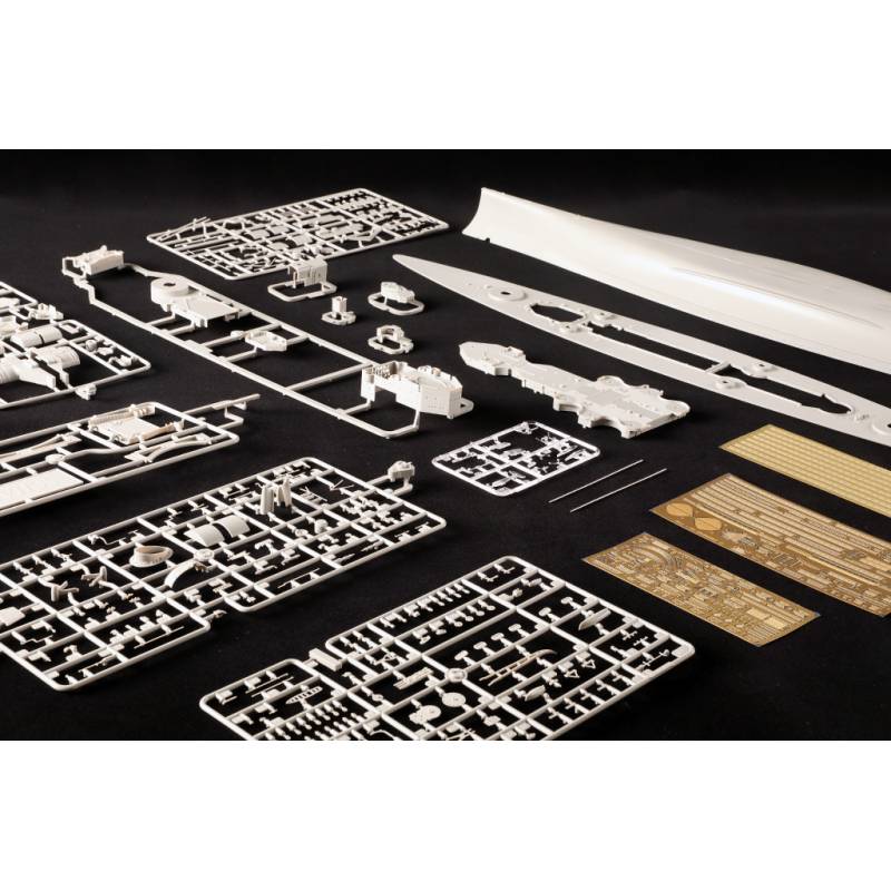 Plusieurs pièces en photodécoupe sont incluses afin d’améliorer la finesse de certains éléments du navire, tandis que certaines pièces métalliques telles que les arbres d’hélice et la chaîne d’ancre apportent un réalisme supplémentaire. Le kit comprend également un socle de présentation permettant d’exposer le modèle terminé.
