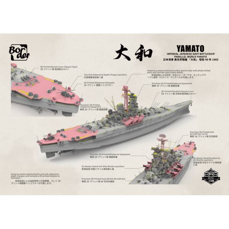 Cette version alternative du légendaire cuirassé Yamato propose une interprétation fascinante d’un navire modernisé dans un univers fictif situé en 1965. Inspiré d’une œuvre de fiction contemporaine "Le maitre du Haut Chateau", ce “Yamato revisité” imagine ce qu’aurait pu devenir le plus puissant cuirassé de l’histoire s’il avait poursuivi sa carrière après la Seconde Guerre mondiale, dans un contexte technologique profondément transformé par l’ère des missiles et de l’électronique avancée.
