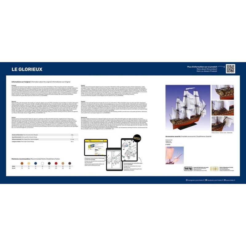 Le montage de Le Glorieux nécessite patience et précision, surtout pour le gréement et les voiles. Cependant, le Starter Kit de Heller rend l'expérience plus accessible, notamment pour les débutants, grâce aux peintures, au pinceau et à la colle inclus dans le coffret. Les instructions de montage, illustrées étape par étape, facilitent l'assemblage et permettent de suivre la progression du modèle pièce par pièce. Les modélistes plus expérimentés pourront, quant à eux, ajouter des détails supplémentaires ou une patine pour simuler l’usure naturelle du navire.