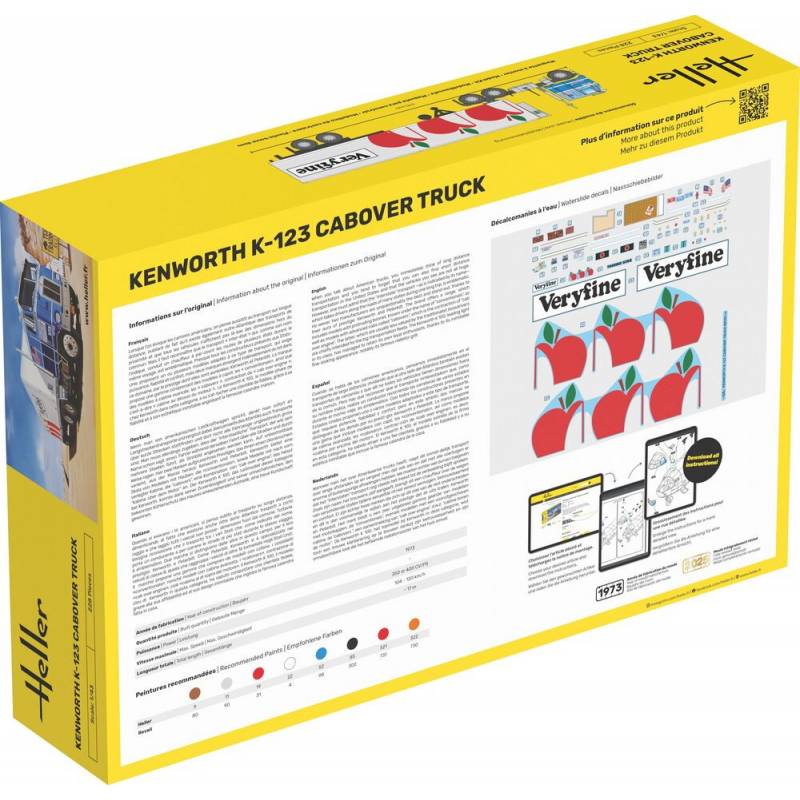 Maquette HELLER 1/43 du Kenworth K-123, camion américain cabover emblématique. 228 pièces, 37 cm de long, détails réalistes et finition typique HELLER.