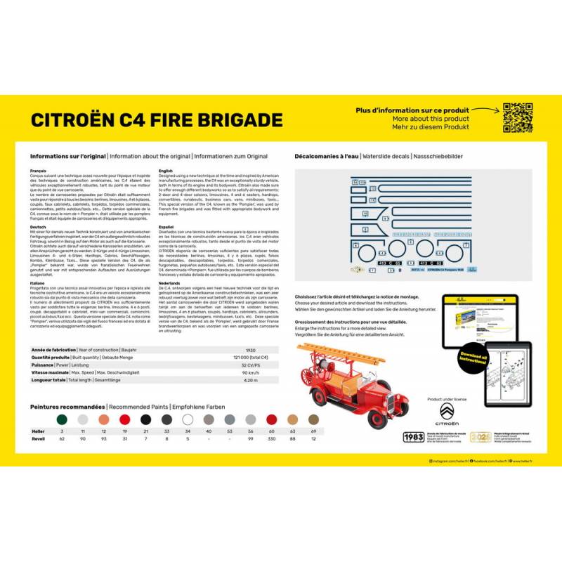 Le kit Heller 1/24 offre une reproduction fidèle de ce véhicule emblématique, avec une carrosserie finement détaillée et une silhouette parfaitement restituée. Les lignes caractéristiques du C4, la calandre Citroën, la plateforme arrière et les équipements de pompier sont reproduits avec soin pour une présentation réaliste du modèle historique.