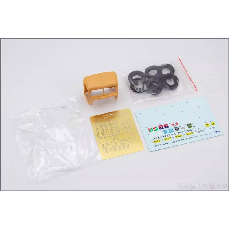 Le kit inclut des détails intérieurs, élément essentiel pour ce type de véhicule où la cabine reste visible et contribue fortement au réalisme global. Les pièces transparentes permettent un rendu fidèle des vitrages, tandis que les éléments en photodécoupe apportent finesse et précision sur les détails les plus délicats. L’ensemble offre une base de travail intéressante pour les amateurs de patine, ces camions se prêtant particulièrement bien aux effets d’usure, de poussière, de boue ou de traces de chantier, notamment pour les versions benne.