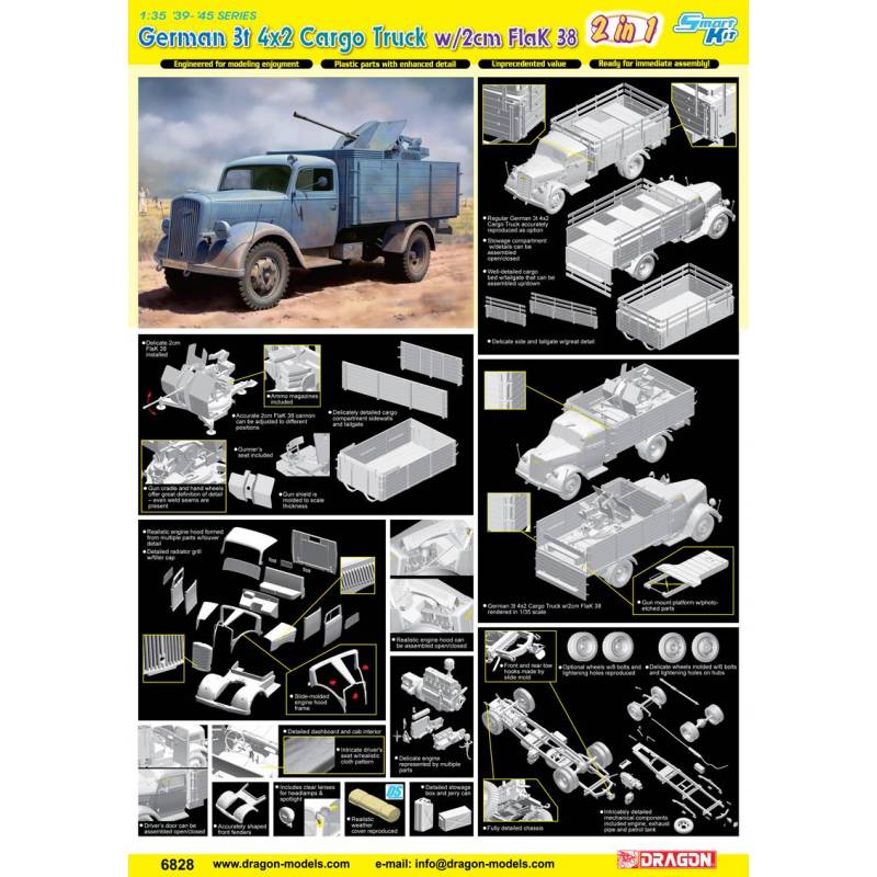 Dragon DML a fait un travail remarquable dans le développement de ce kit au 1/35ème du camion 3t 4x2 le rendant encore plus attrayant par le fait qu'il est un kit 2-en-1, les modélistes ayant l'option d'assemblage d'un camion régulier de fret, ou un montage d'un canon de 2cm Flak 38 dans la benne arrière.