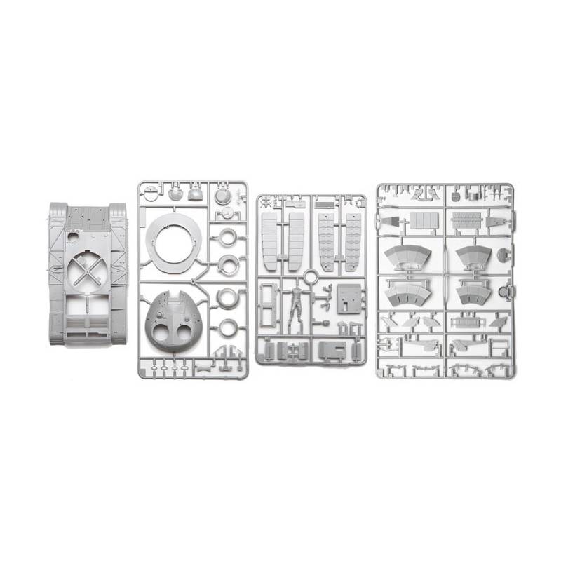 Les blocs de blindage de la tourelle sont fournis avec leurs cadres séparés afin d’offrir un niveau de détail accru. Les blocs de blindage de caisse sont moulés avec leurs supports pour faciliter l’assemblage tout en conservant un rendu réaliste. Le train de roulement est complété par des chenilles de type souple (belt-type tracks), permettant un montage simple et efficace.