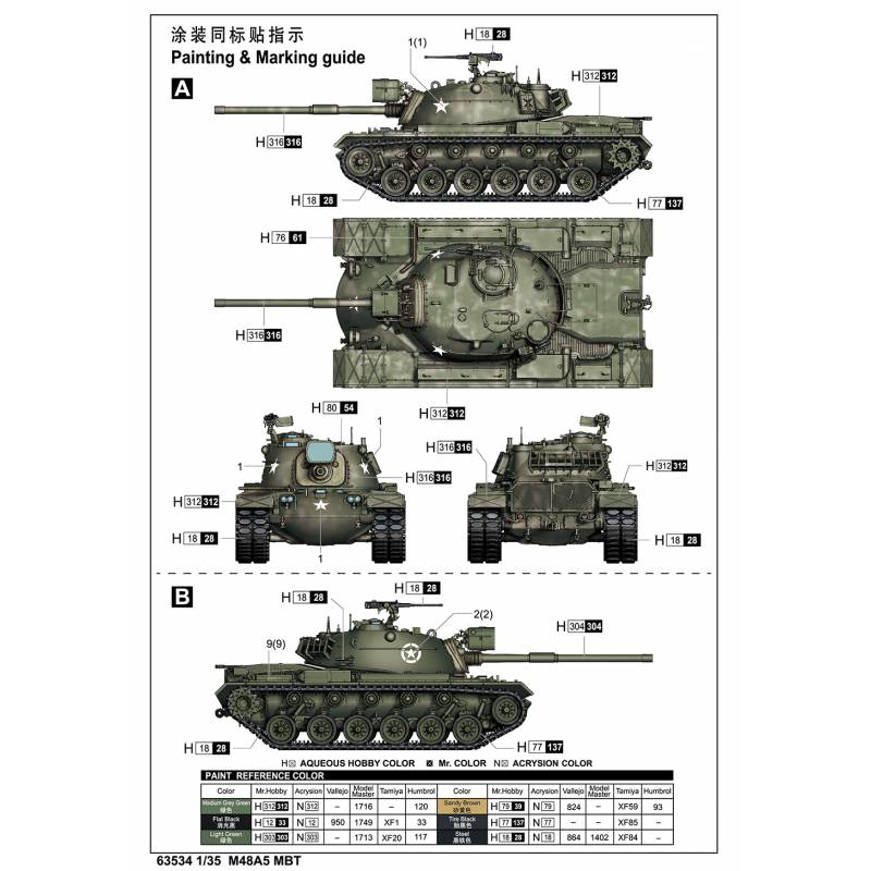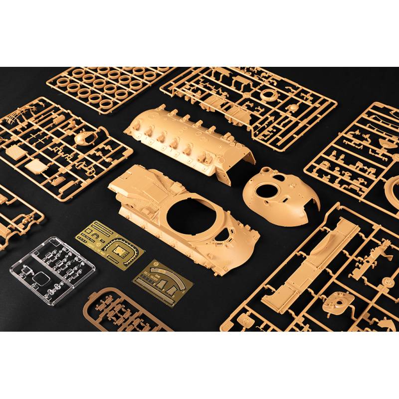 La version M48A5, reproduite dans ce kit, est l’une des plus abouties de la série. Modernisée au cours des années 1970, elle conserve l’architecture robuste du M48, tout en recevant un canon de 105 mm M68 (équivalent américain du L7 britannique), un système de conduite de tir amélioré et une motorisation diesel plus performante. Cette configuration prolongera considérablement la durée de vie opérationnelle du Patton, le rendant encore apte au combat dans plusieurs armées alliées jusqu’au XXIe siècle.
