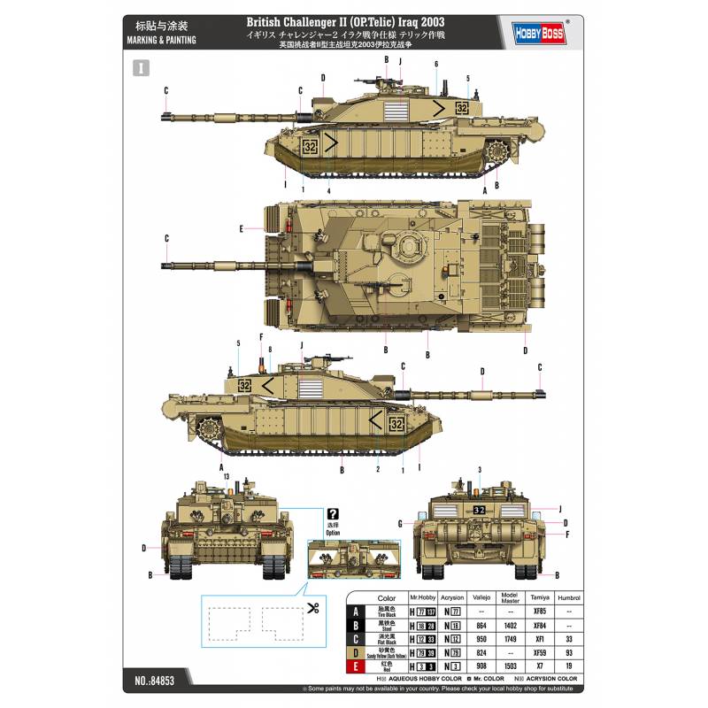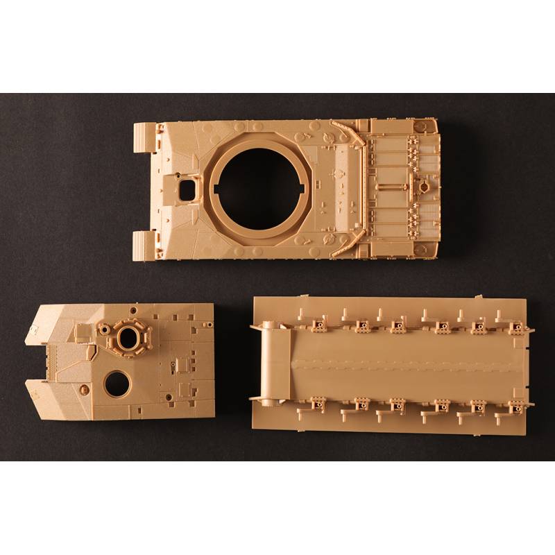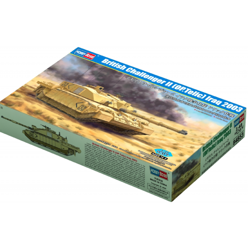 Le kit Hobby Boss 84853 au 1/48 propose une reproduction soignée et fidèle de ce char emblématique de l’armée britannique. Composé de plus de 190 pièces réparties sur 7 grappes, il présente des pièces redessinées pour correspondre précisément à la configuration Op. Telic :