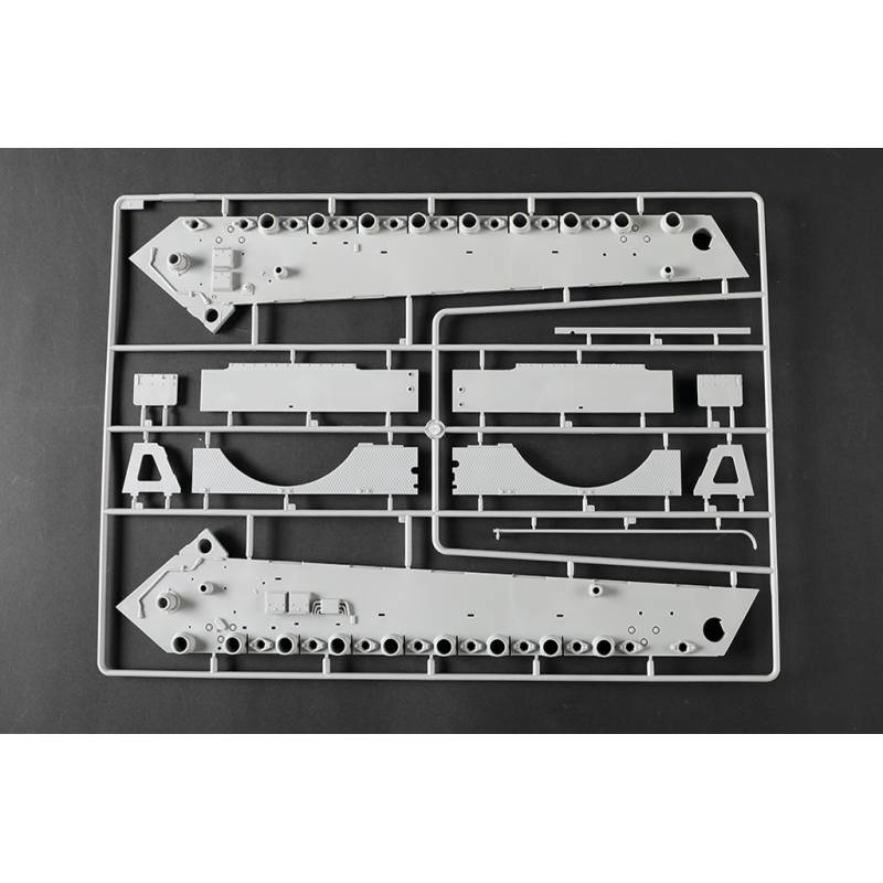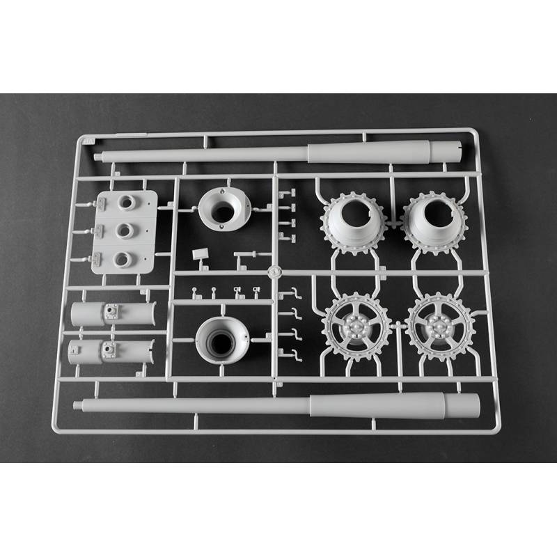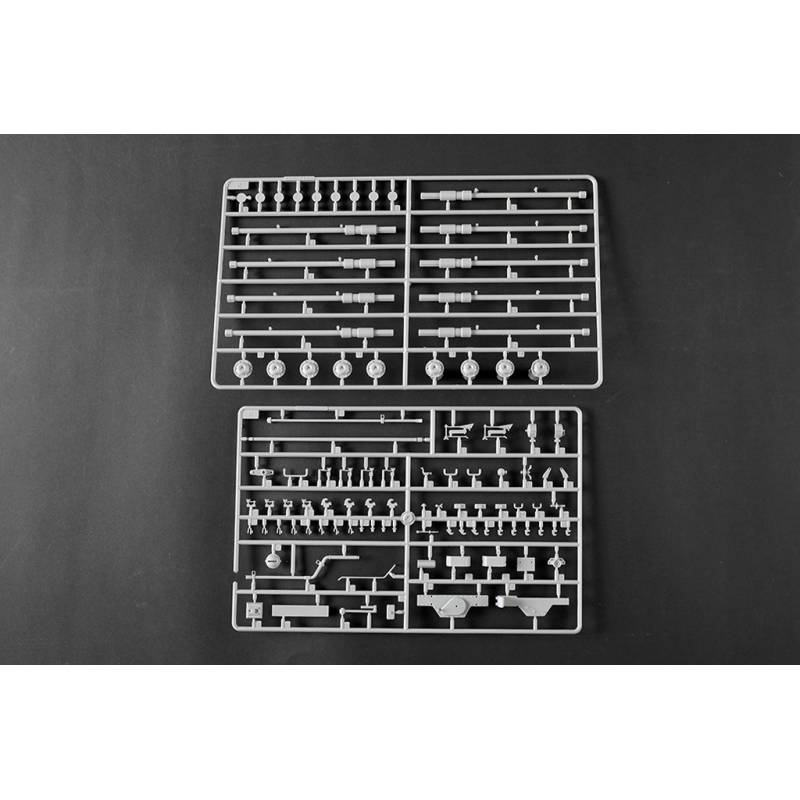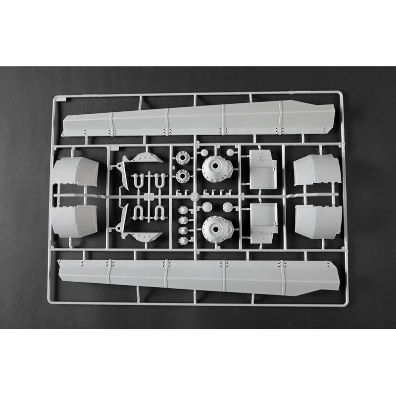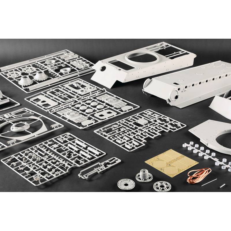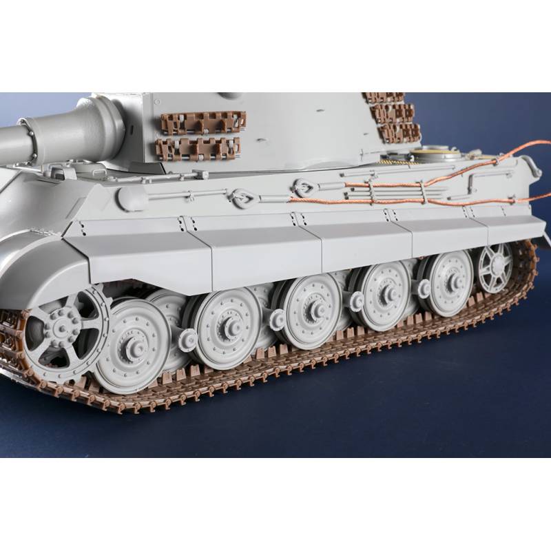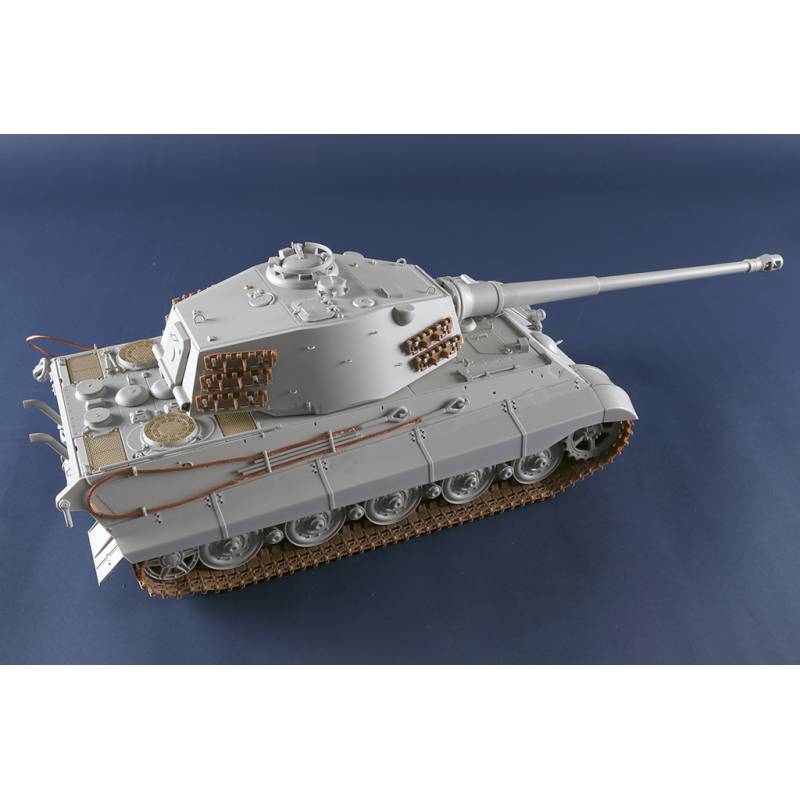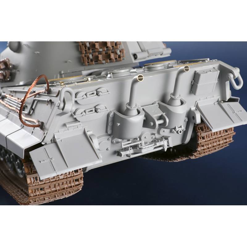 La maquette Trumpeter au 1:16 constitue une reproduction spectaculaire et extrêmement complète de ce char légendaire. Avec plus de 1 500 pièces, elle propose une caisse supérieure et inférieure moulées par glissières multi-directionnelles, un intérieur entièrement détaillé, une tourelle complète et des chenilles à maillons individuels. Des éléments en photodécoupe, des pièces métalliques (tube de canon, câbles cuivre, axes et ressorts) viennent enrichir le réalisme de l’ensemble. Le modèle assemblé atteint environ 706 mm de longueur pour 233 mm de largeur, faisant de ce kit une pièce maîtresse pour les maquettistes experts et les passionnés de blindés allemands lourds.