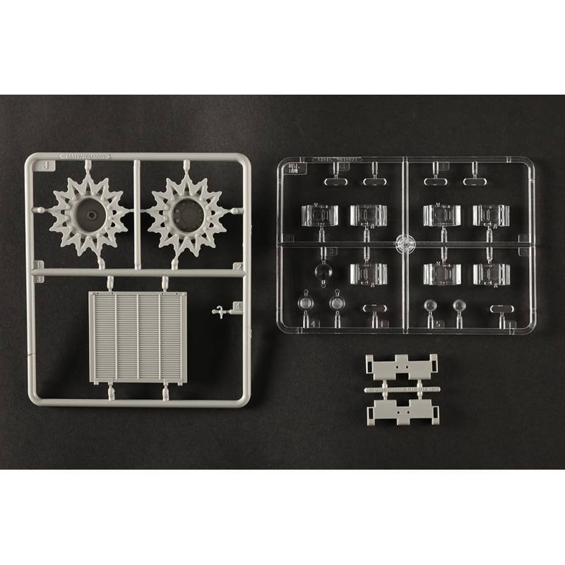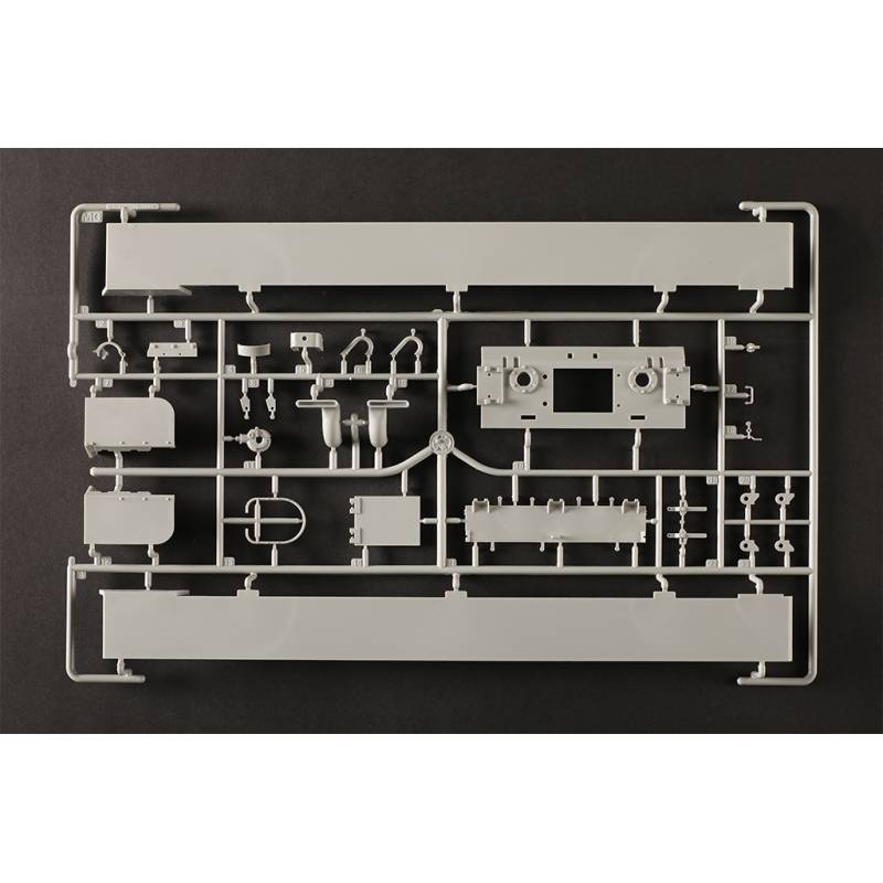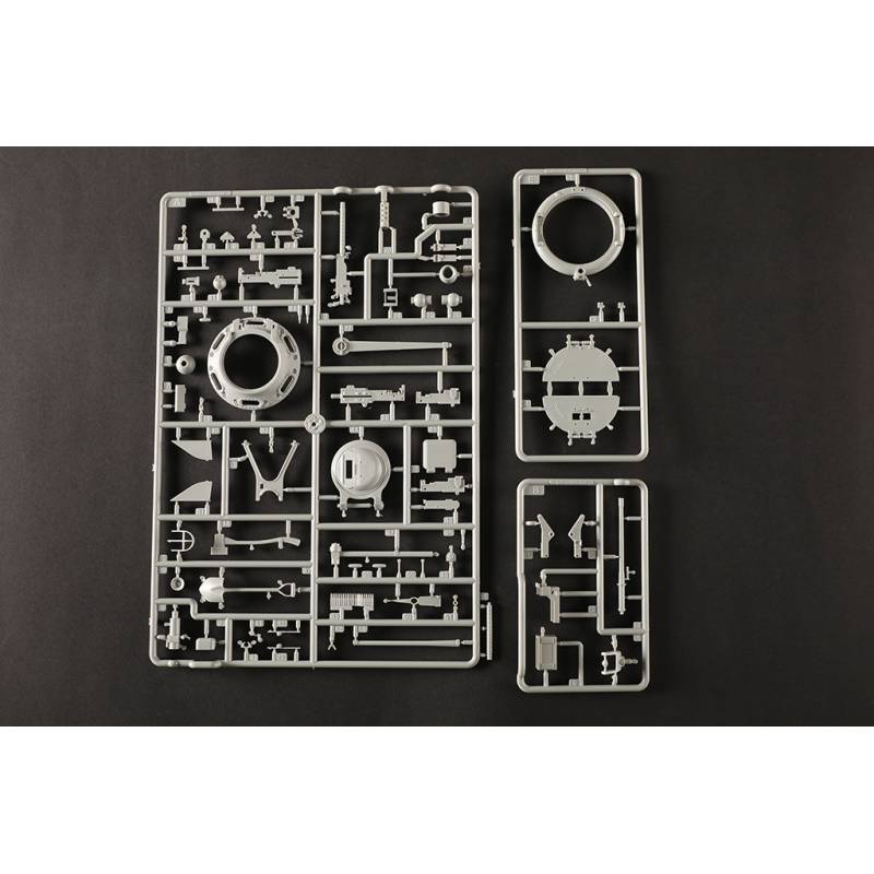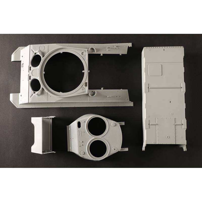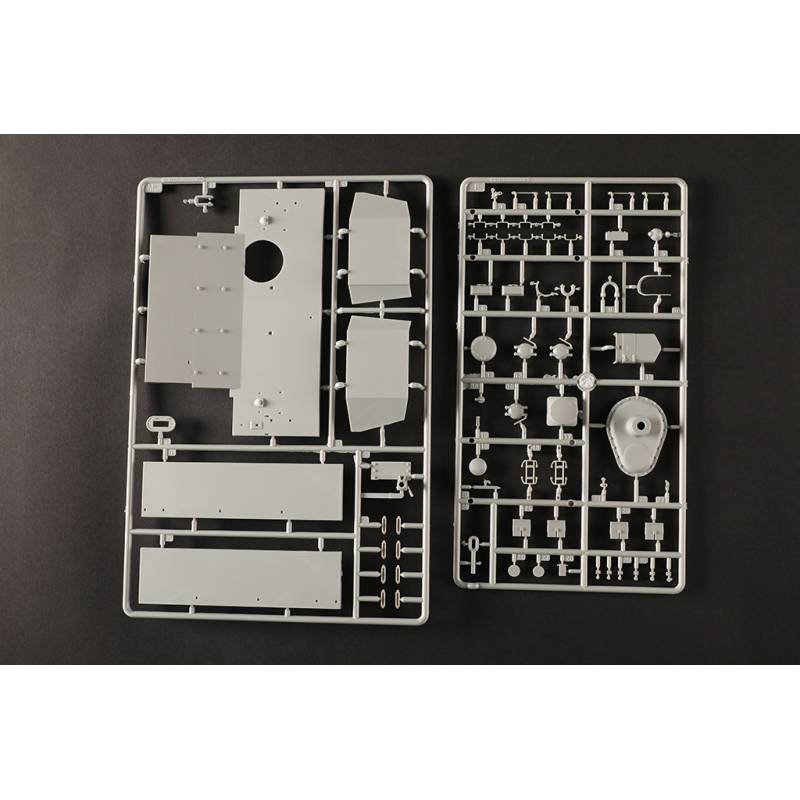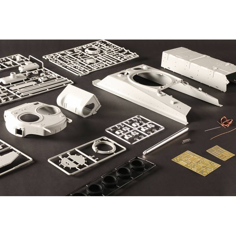 Avec plus de 1200 pièces, ce modèle offre un niveau de détail très élevé. La caisse inférieure, la caisse supérieure et la tourelle sont moulées à l’aide de moules multi-glissières permettant une reproduction très précise des formes et des détails. Les chenilles sont composées de maillons individuels, ce qui permet d’obtenir un rendu réaliste une fois le modèle assemblé.