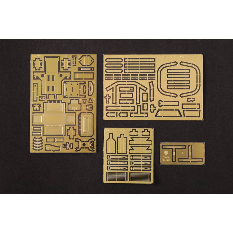 Plusieurs pièces métalliques sont incluses dans le kit, notamment le tube du canon, des ressorts, un câble en cuivre, des arbres mécaniques et une chaîne. Des éléments en photodécoupe sont également fournis afin d’améliorer la finesse de certains détails.