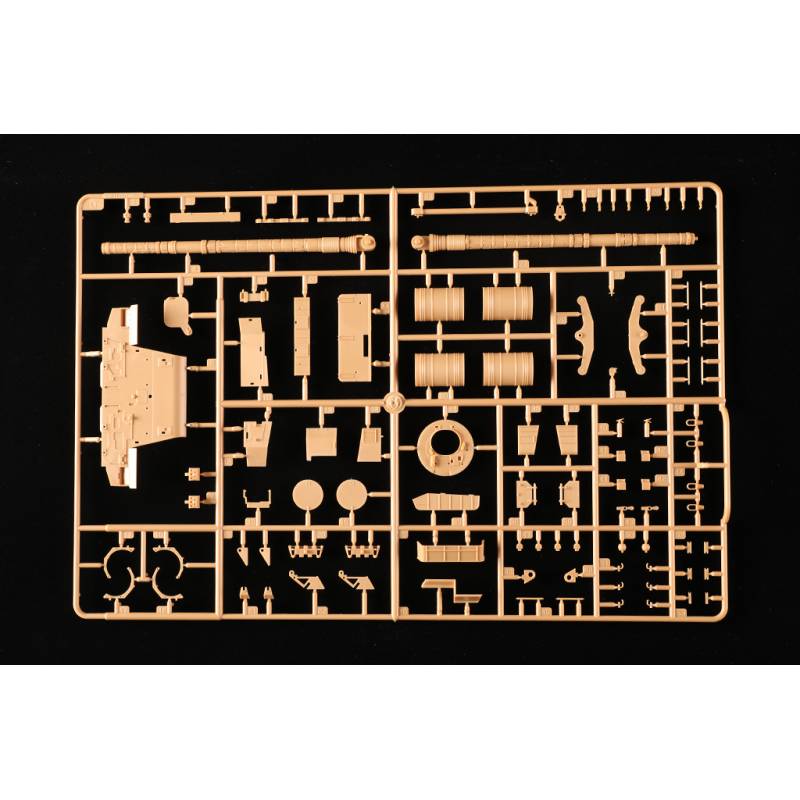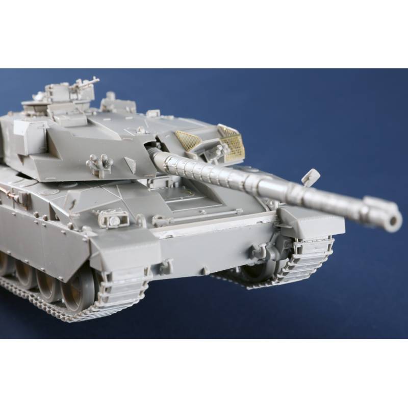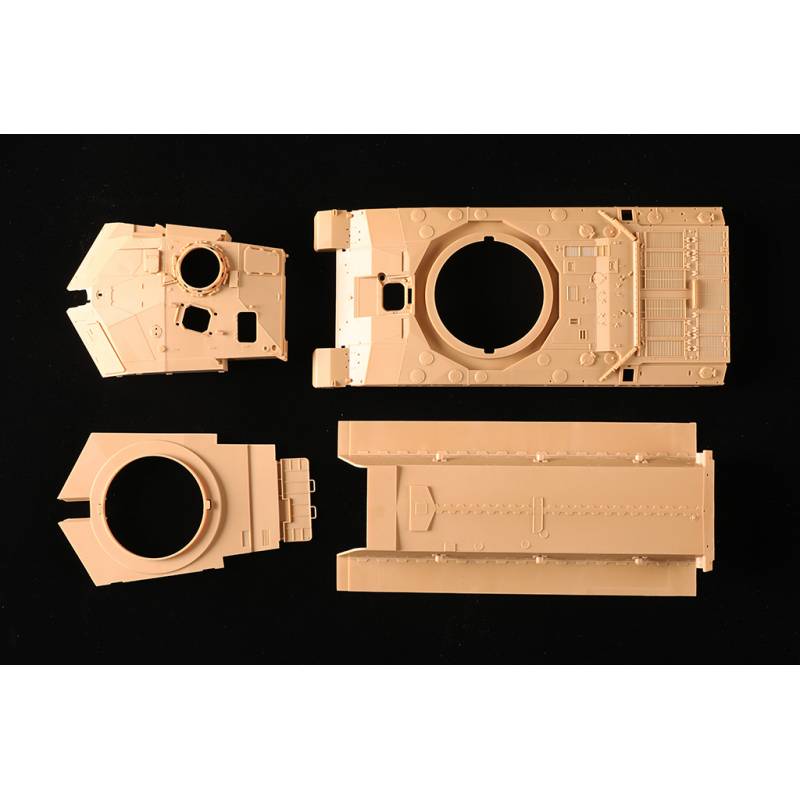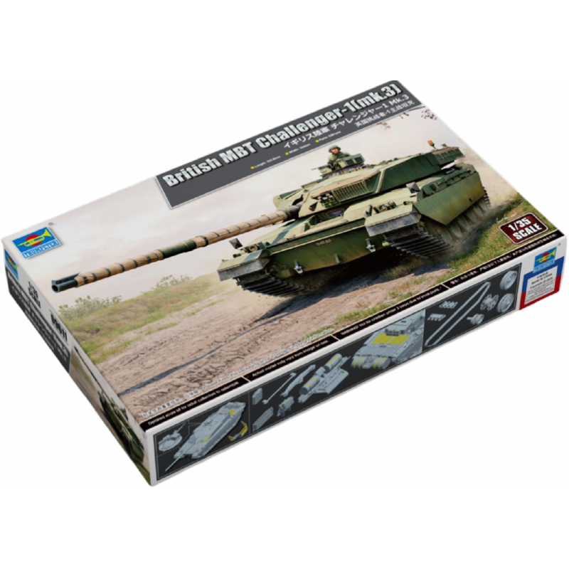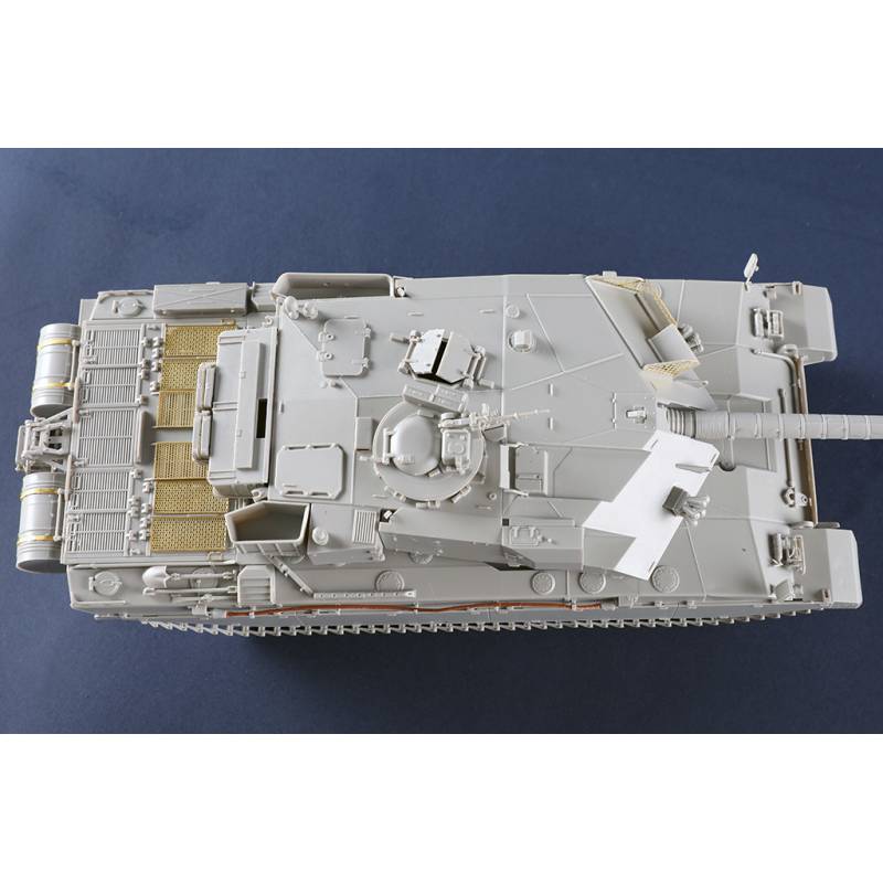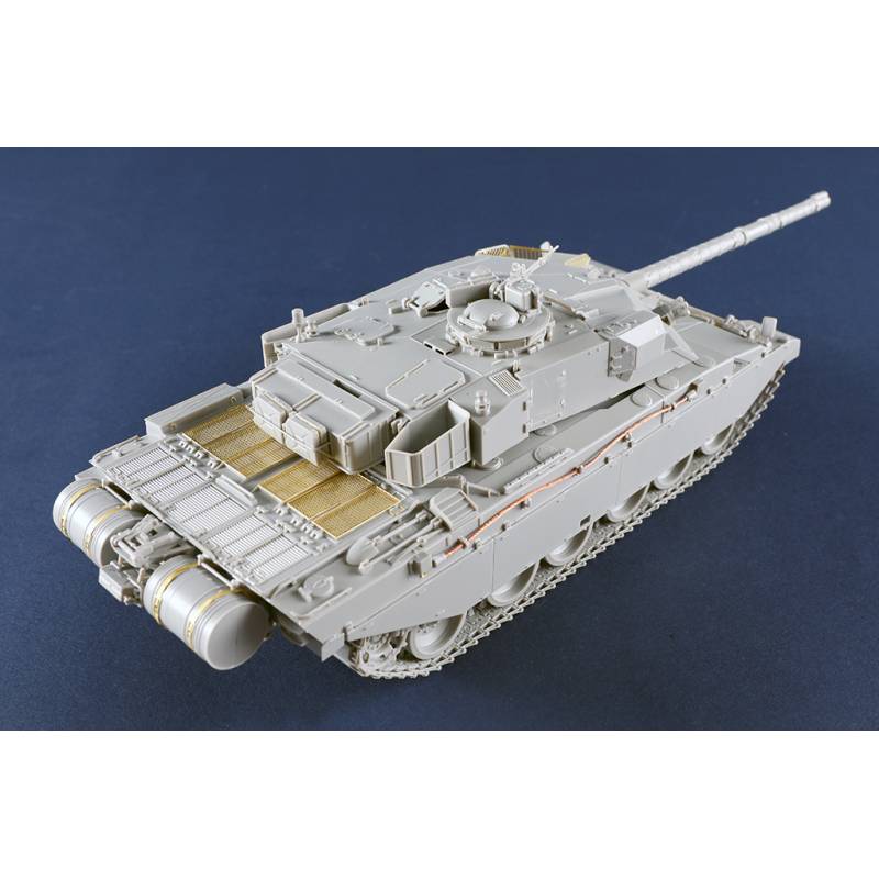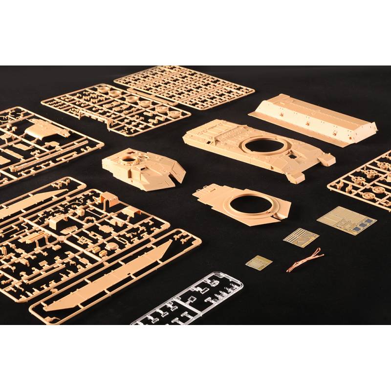 La maquette Trumpeter au 1/35 reproduit fidèlement ce char de combat principal britannique avec un niveau de détail élevé. Le kit comprend plus de 630 pièces réparties sur 14 grappes ainsi que la caisse supérieure, la caisse inférieure et la tourelle. Les différentes parties du véhicule sont moulées à l’aide de moules multi-glissières afin de restituer précisément les formes et les détails du char.