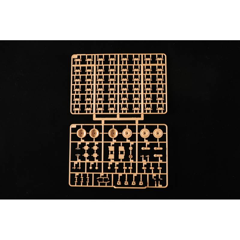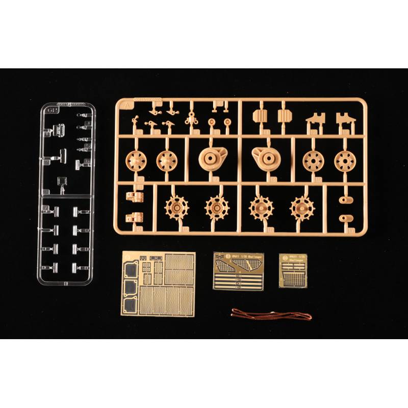 Les chenilles sont reproduites avec des maillons individuels permettant un rendu réaliste une fois assemblées. Des pièces en photodécoupe sont incluses pour affiner certains éléments du modèle, tandis qu’un câble en cuivre est fourni pour reproduire fidèlement les équipements extérieurs du véhicule.
