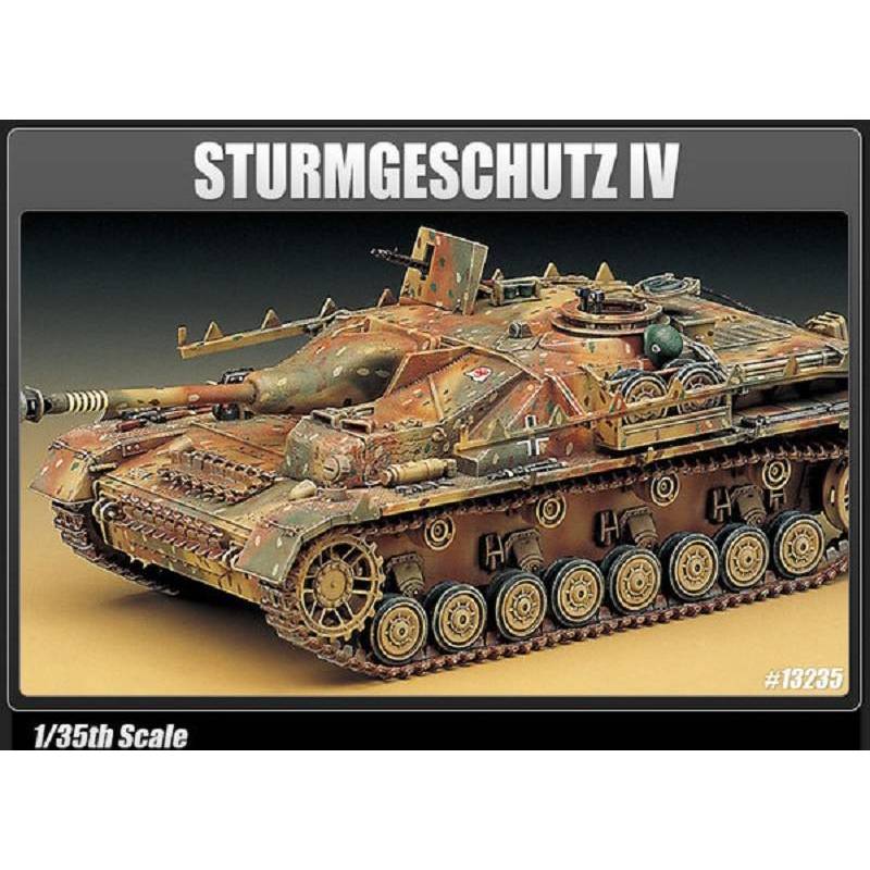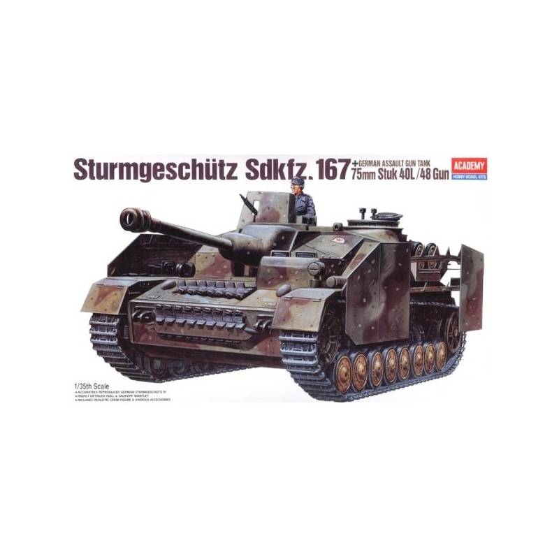 La maquette du char German Assault Gun Tank Sturmgeschütz Sdkfz. 167 | ACADEMY | 13235 | échelle 1:35, représente un modèle du StuG IV, un canon d'assaut allemand introduit durant la Seconde Guerre mondiale. Face à une demande croissante pour des canons d’assaut mobiles capables d’appuyer l’infanterie, le StuG IV a vu le jour en décembre 1943, à partir d'une conception hybride combinant la superstructure modifiée du Sturmgeschütz III avec le châssis du Panzerkampfwagen IV. Cette combinaison a été possible en partie grâce à la société Krupp, qui n’était pas impliquée dans la construction des Panzer III et a donc utilisé la coque du Panzer IV pour ce nouveau modèle.