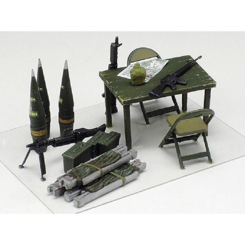 Contribution Tamiya : trois figurines, armes légères, casques, lits pliants.