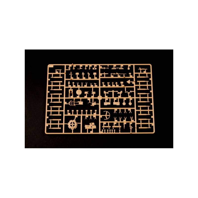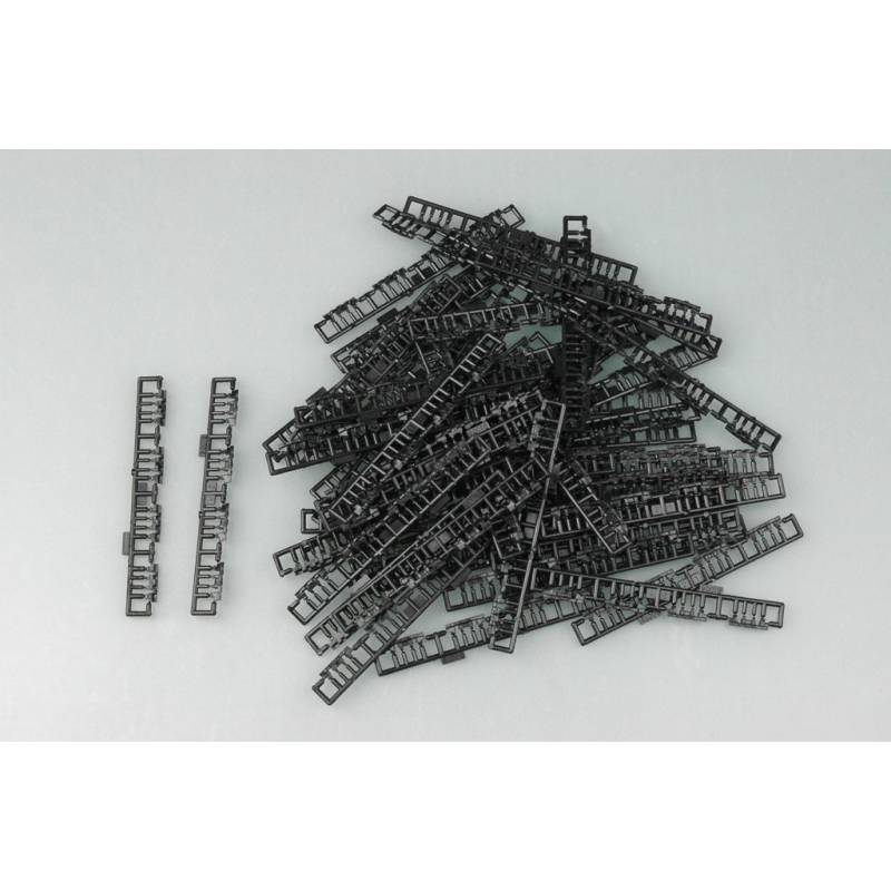 Planche de photo-découpe, cable de remorquage en métal torsadé, chenilles "maillon par maillon" en plastique injecté.