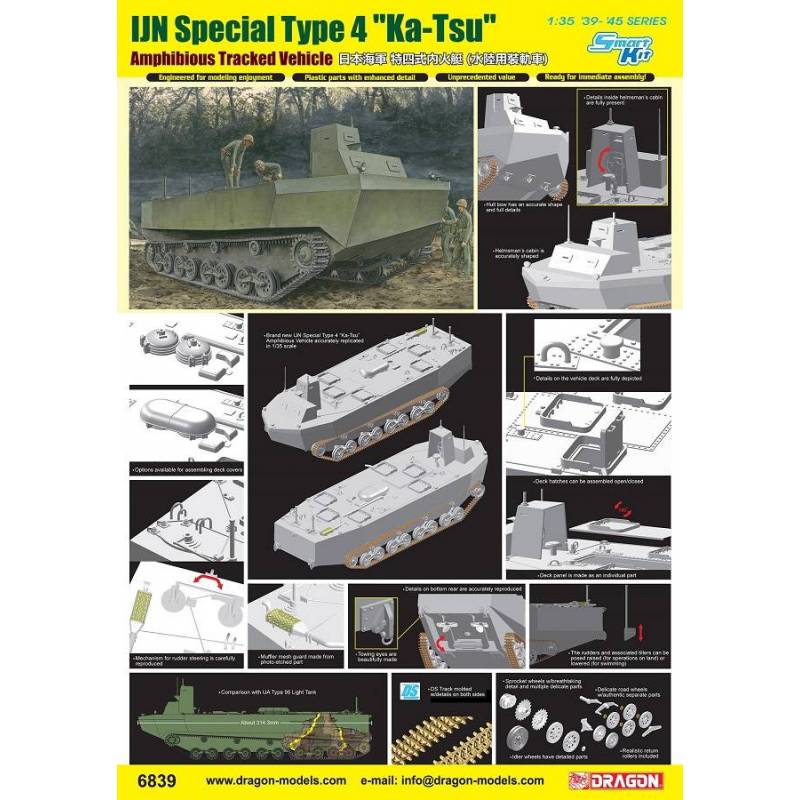Ce nouveau "Ka-Tsu" possède surtout des nouvelles parties ouvragées, puisque c'est un sujet tout à fait différent d'autres véhicules blindés japonais de la Seconde Guerre mondiale. En fait, les seules parties en commun avec des sorties de Dragon précédentes sont ses roues et chenilles, la coque moulée est faite d'une seule pièce qui facilite la construction et assure l'exactitude. Les détails sur le sommet de la coque sont finement reproduits, comme est la cabine en avant de la coque. Pour un véhicule nouveau et peu connu de l'armée japonaise de la Seconde Guerre mondiale, ce kit 1/35 du Dragon est un complément brillant à la catégorie.