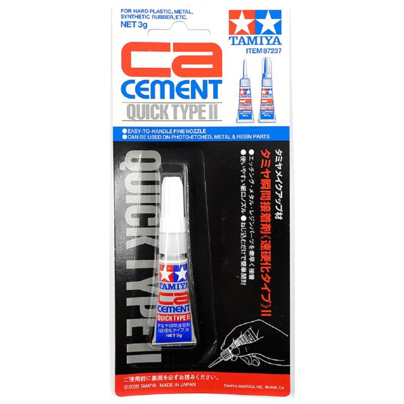 La colle cyanoacrylate Tamiya CA Cement Quick Type II est une version améliorée et plus pratique de la célèbre colle Tamiya 87062. Conditionnée dans un tube en aluminium équipé d’une canule de précision en plastique, elle offre une application propre, contrôlée et sans gaspillage.