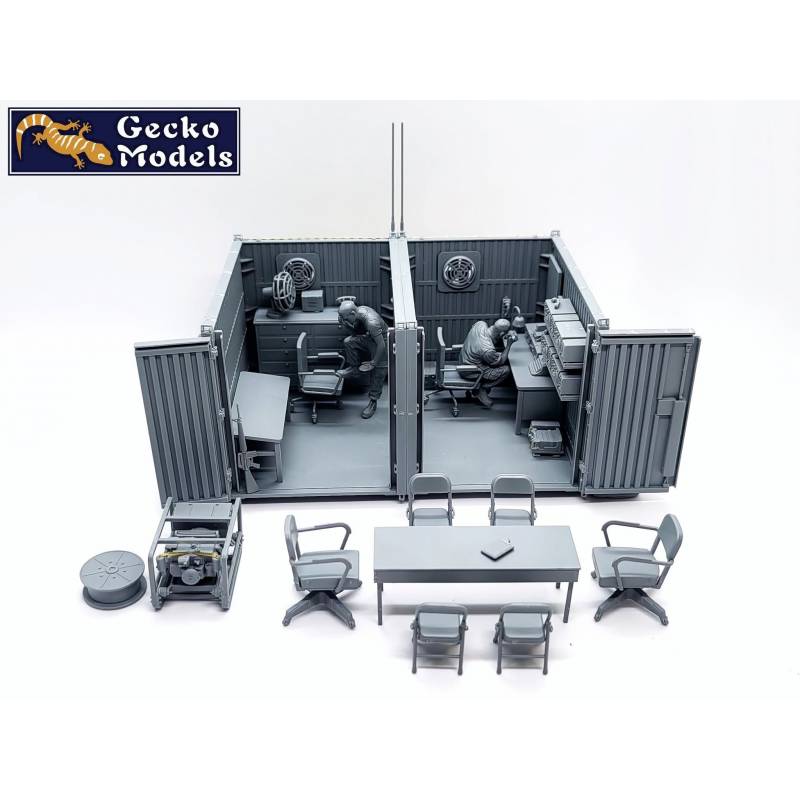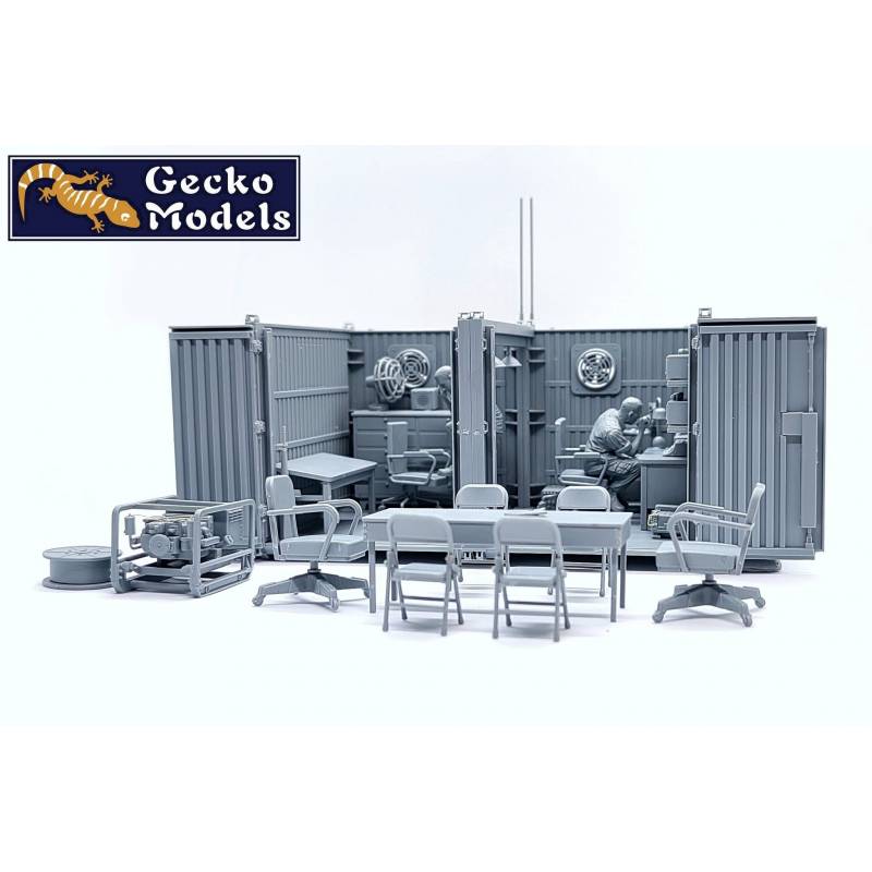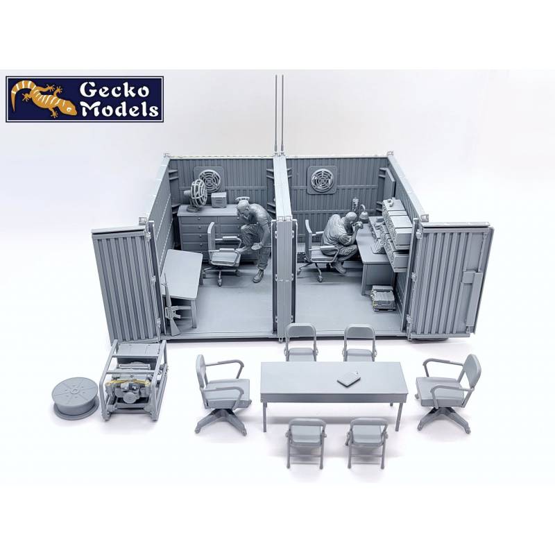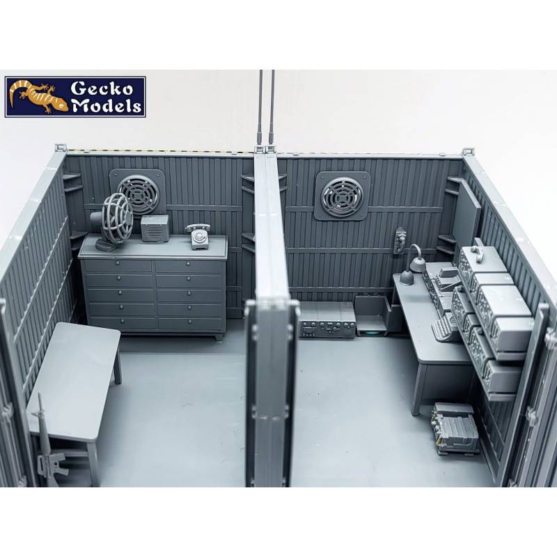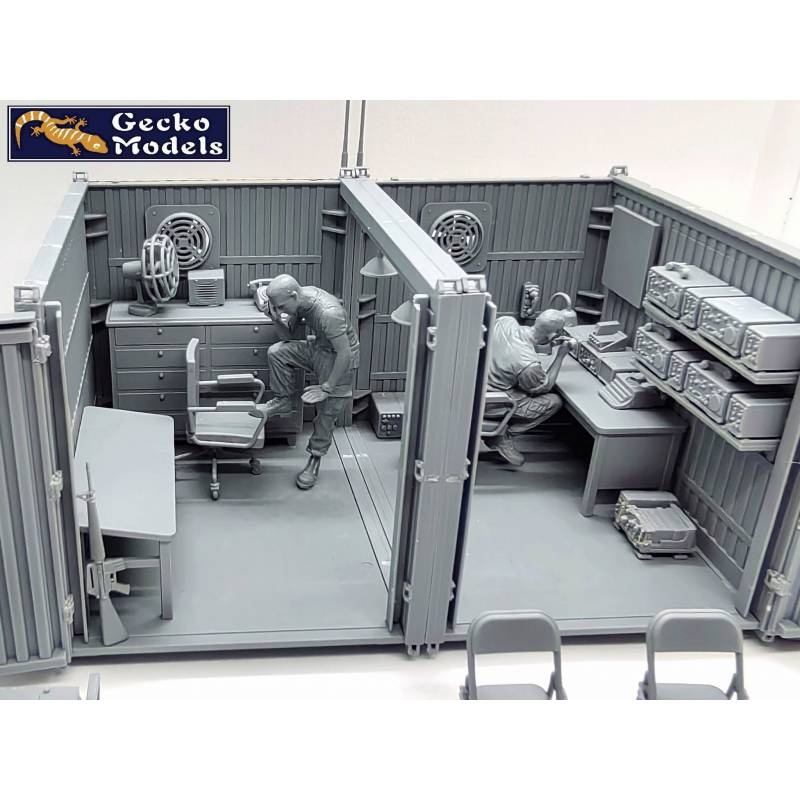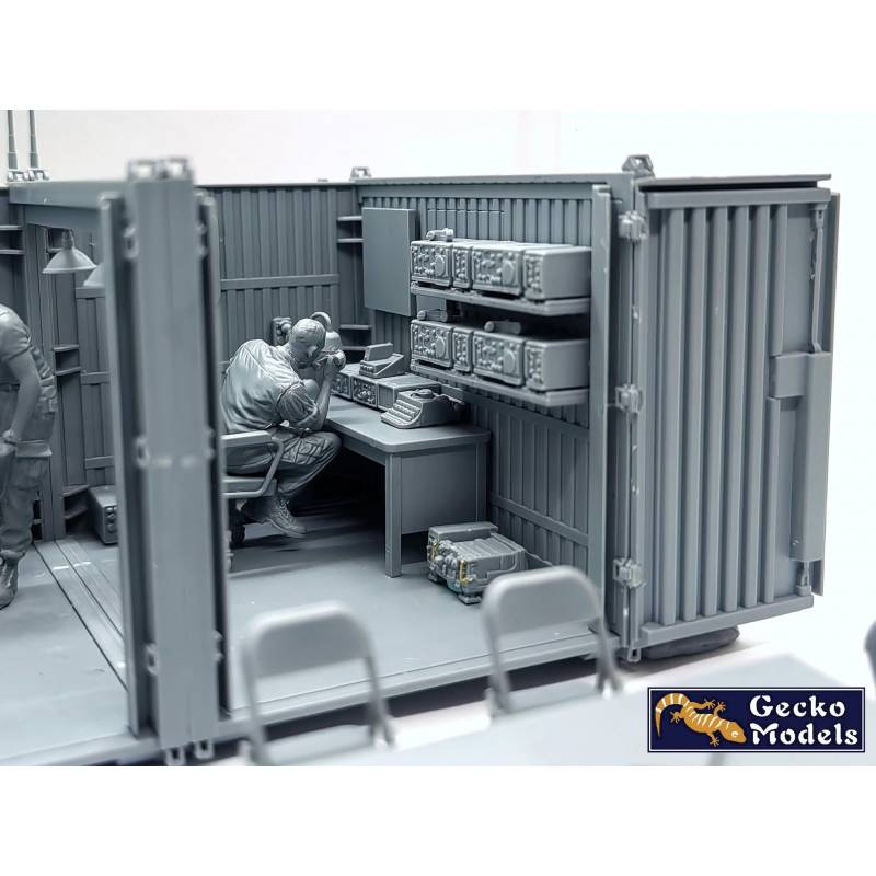 Le diorama GECKO MODELS 35GM0119 est composé de deux containers aménagés en poste de commandement temporaire, ainsi que de deux figurines américaines incluses d’origine. Cet ensemble permet de représenter immédiatement une scène opérationnelle crédible de la guerre du Vietnam, sans nécessiter d’achats complémentaires, et constitue une base idéale pour un diorama complet mêlant commandement, logistique et vie de base avancée.