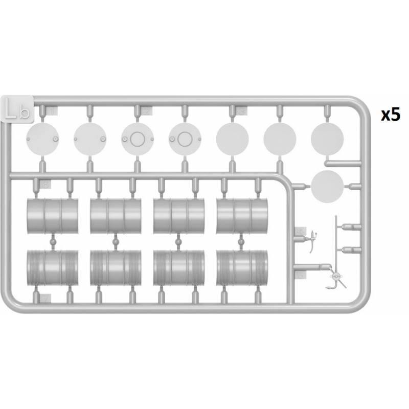 Le coffret contient 12 fûts de carburant non assemblés, finement moulés, avec une gravure réaliste des nervures, cerclages et bouchons. Ces éléments constituent une excellente base pour la peinture et la patine, permettant de représenter des fûts neufs, usés, cabossés, rouillés ou souillés par le carburant, selon le contexte de la scène.