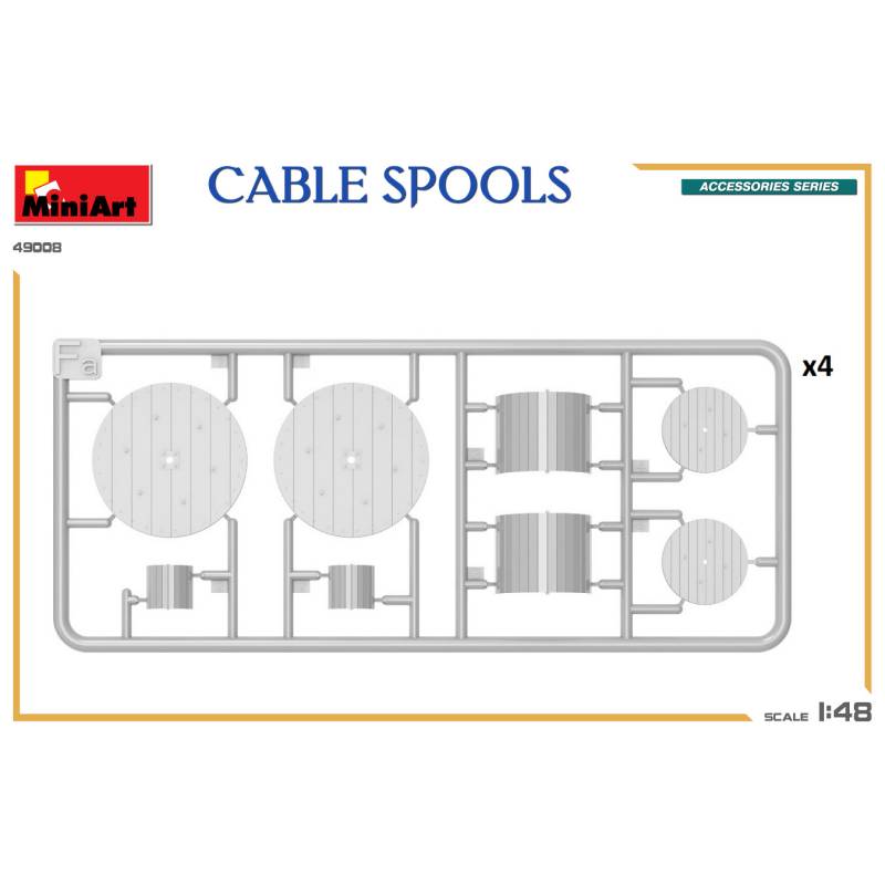 Le coffret contient huit tourets de câbles non assemblés, finement moulés, avec une reproduction réaliste des flasques, du moyeu central et des textures de surface. La conception offre une excellente base pour la peinture et la patine, permettant de représenter des matériaux neufs ou usés selon le contexte du diorama.