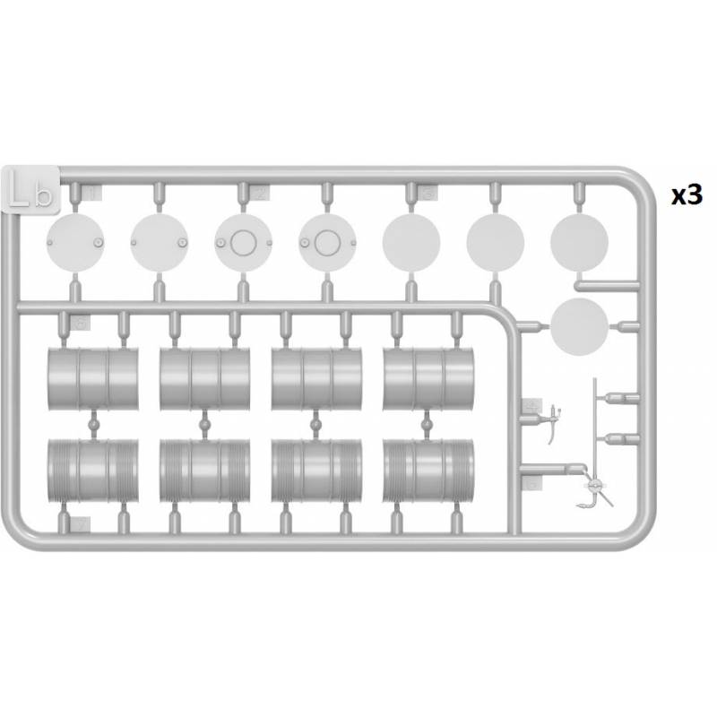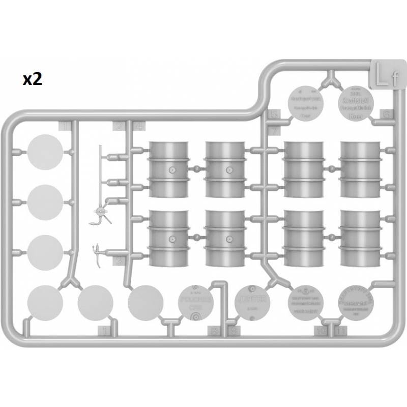 Le coffret contient 20 fûts non assemblés, finement moulés, avec une reproduction réaliste des nervures, cerclages, bouchons et surfaces métalliques. La qualité de gravure offre une excellente base pour la peinture et la patine, permettant de représenter des fûts neufs, usés, rouillés, cabossés ou souillés par le carburant, selon le contexte du diorama.