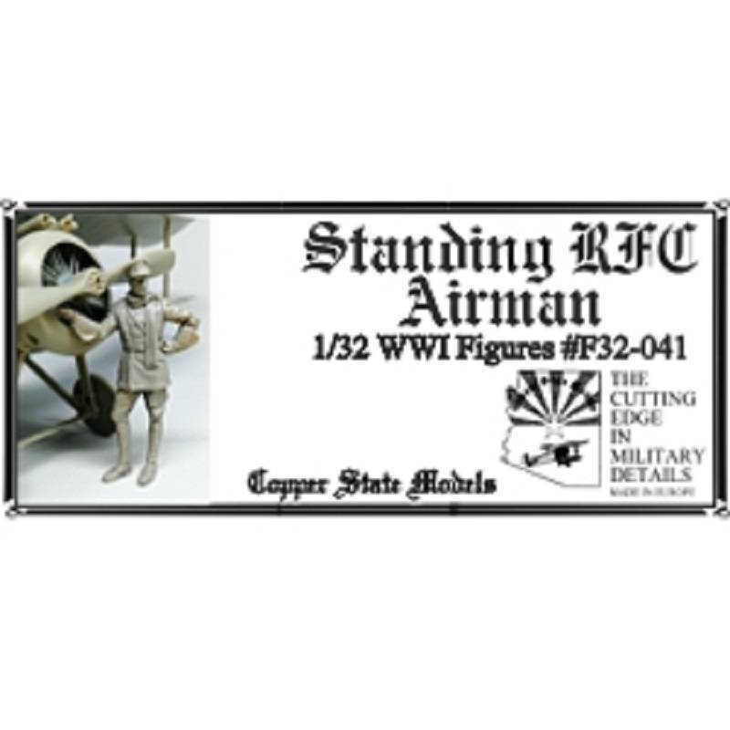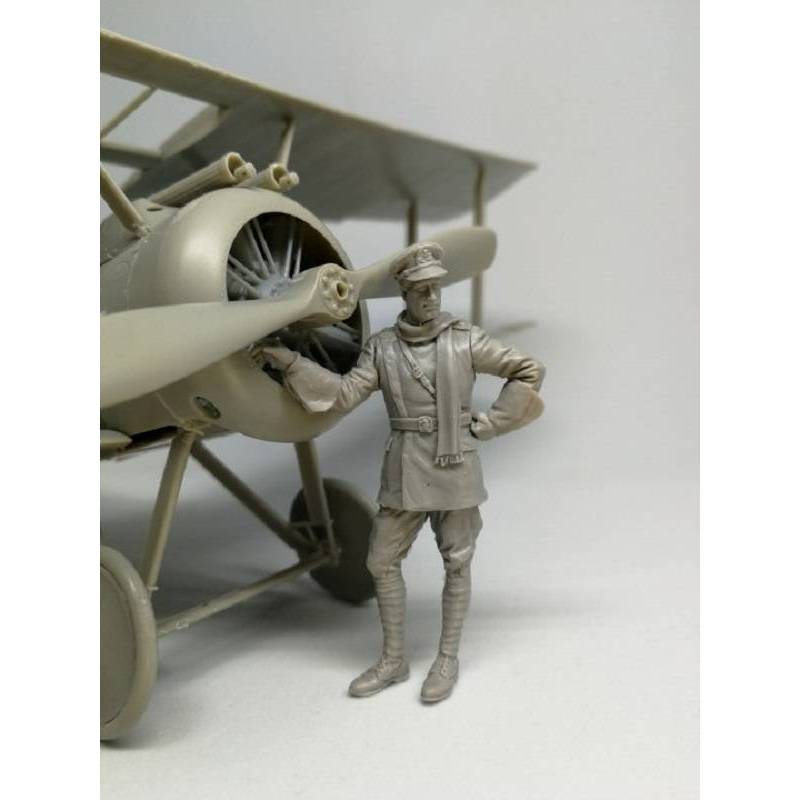 La figurine représentée ici illustre un aviateur typique du RFC, vêtu de son uniforme de service ou de vol, mains sur les hanches ou dans les poches selon l’interprétation du maquettiste, visage serein mais concentré. La sculpture offre un haut niveau de détail sur les éléments caractéristiques : veste croisée, bottes, couvre-chef éventuellement amovible selon la mise en peinture. Elle se prête particulièrement bien à l’accompagnement d’un appareil en maintenance, à une scène de briefing ou de retour de mission.