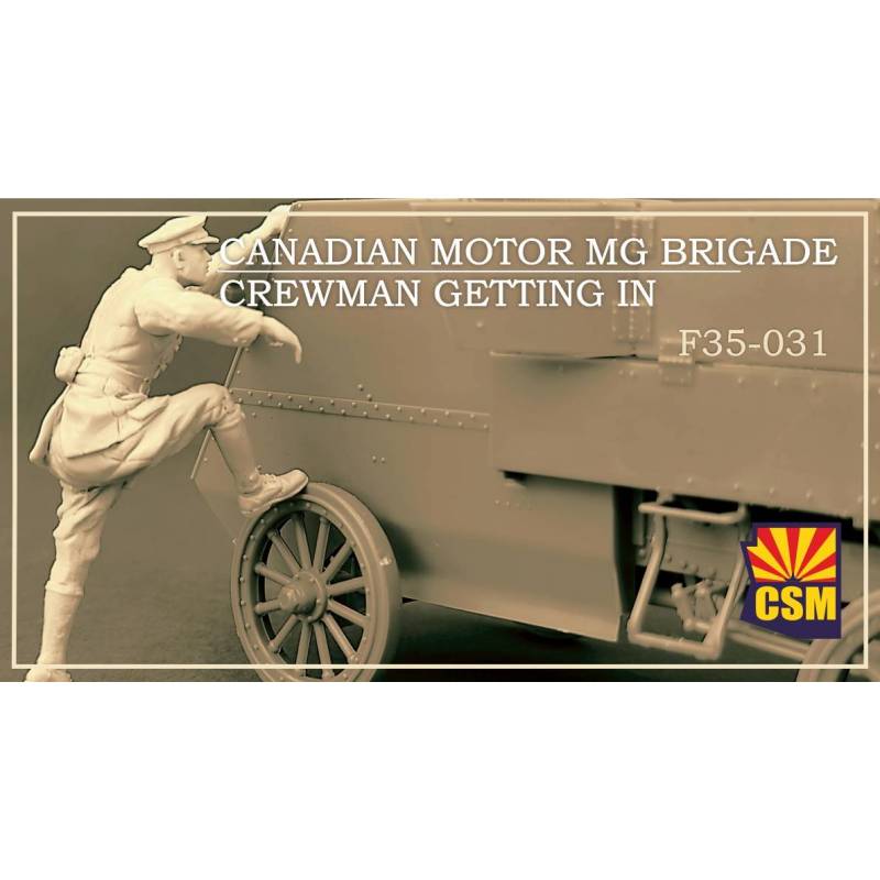 Cette figurine représente un membre d’équipage de la Canadian Motor Machine Gun Brigade en train de monter à bord d’un véhicule blindé, recréant avec fidélité l’apparence et la posture des soldats canadiens engagés dans les premières unités motorisées de la Première Guerre mondiale.