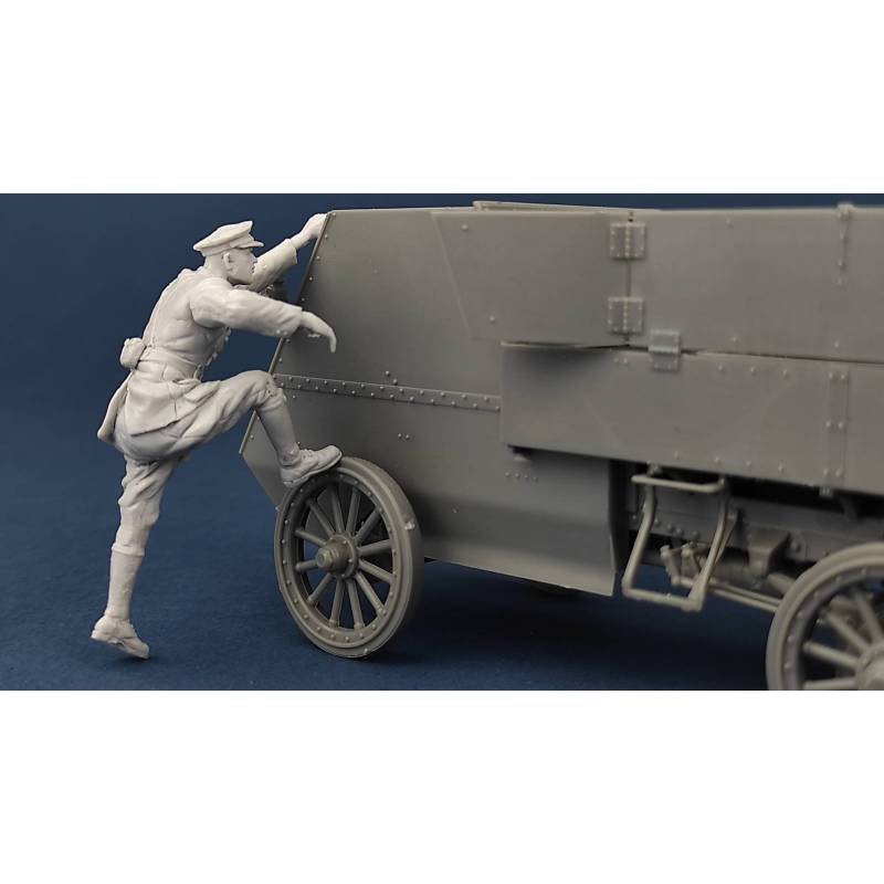 La figurine capture un instant précis du quotidien de ces équipages, alors que le soldat, équipé de son uniforme et de son équipement militaire, grimpe à bord de son véhicule, prêt à se lancer dans l’action. Son attitude traduit la vigilance et l’urgence qui caractérisaient les engagements des unités motorisées, souvent exposées aux tirs ennemis lorsqu’elles se déplaçaient en première ligne.