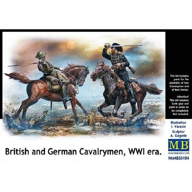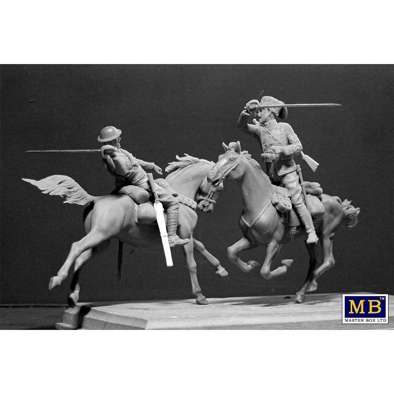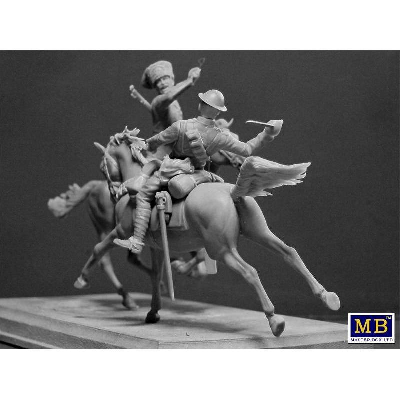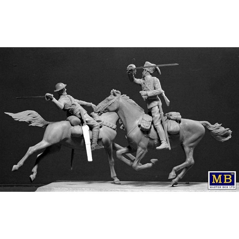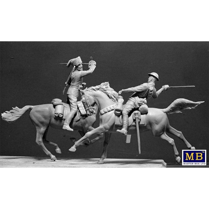 Le kit MASTERBOX 35184 - British and German Cavalrymen, WWI Era à l'échelle 1/35 permet de recréer une scène de combat singulier entre deux cavaliers de la Première Guerre mondiale : un Dragon anglais et un Hussard noir allemand. Cette saynète, constituée de deux figurines en plastique à cheval, offre une vue captivante des engagements de cavalerie au début et au milieu du conflit, entre 1914 et 1916.