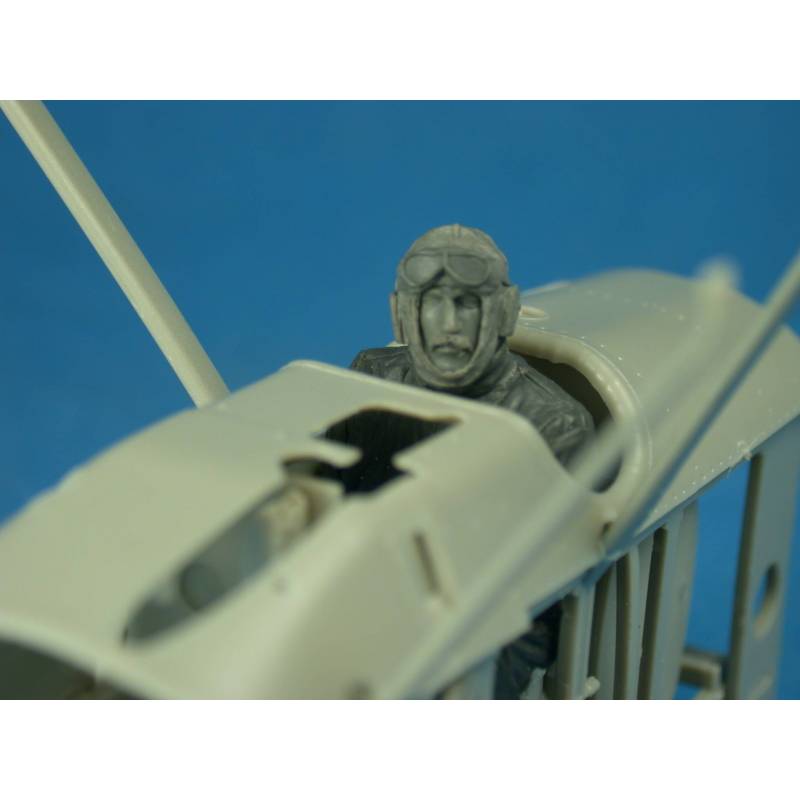 La figurine capturée ici illustre parfaitement cette époque : le pilote est représenté en position assise, les bras et jambes naturellement placés, prêt à être intégré dans le cockpit d’un appareil tel qu’un Sopwith Camel, un Bristol F.2B ou un Royal Aircraft Factory S.E.5a. Le blouson de vol, finement sculpté en résine, révèle une texture réaliste qui facilitera le travail de peinture. Le visage est expressif, concentré, et les détails des accessoires sont nets et fidèles à la tenue réglementaire de l’époque.
