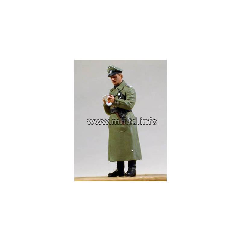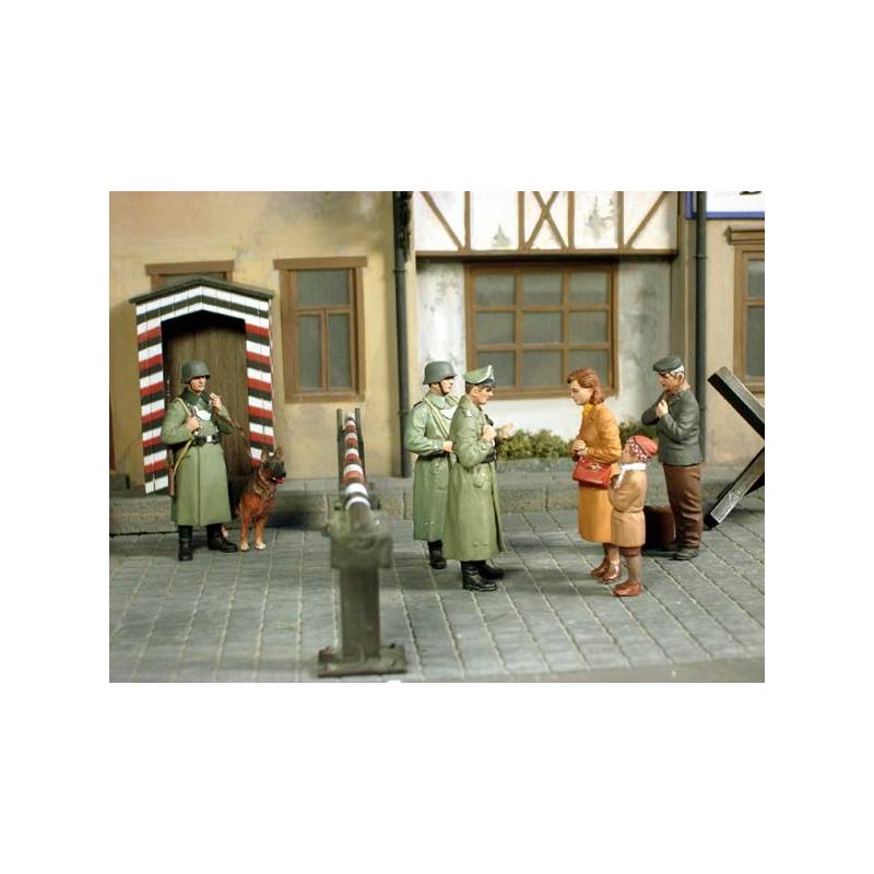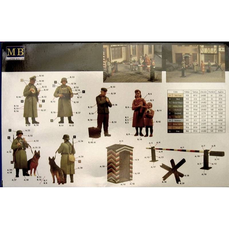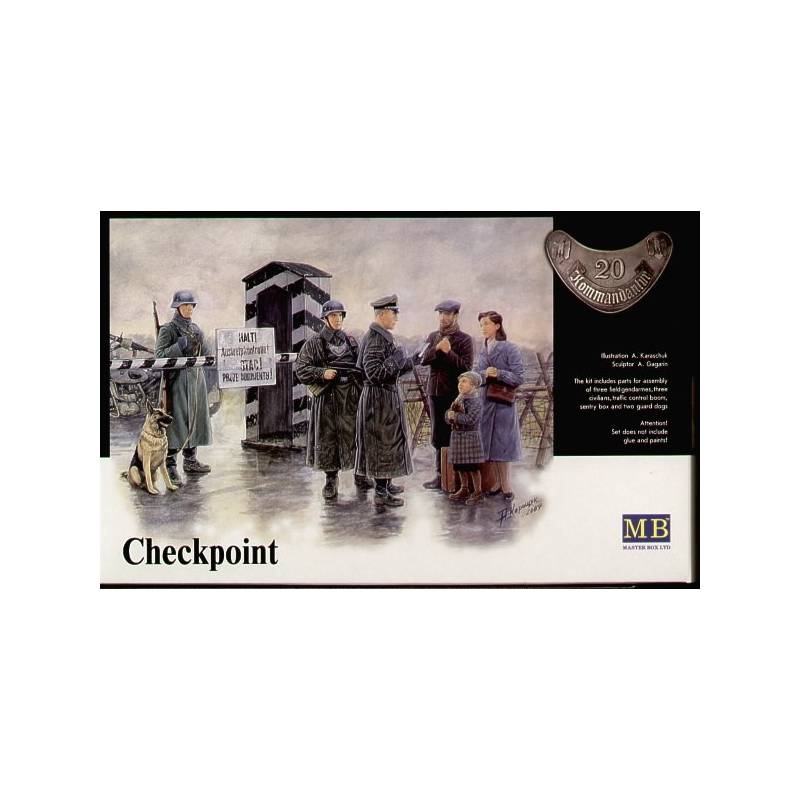 Le kit Master Box Checkpoint Set 1/35 propose 5 figurines et de nombreux accessoires pour représenter une scène de contrôle routier typique de la Seconde Guerre mondiale. Il offre au maquettiste la possibilité de réaliser un diorama narratif, mêlant l’interaction entre soldats allemands et civils sous l’occupation.