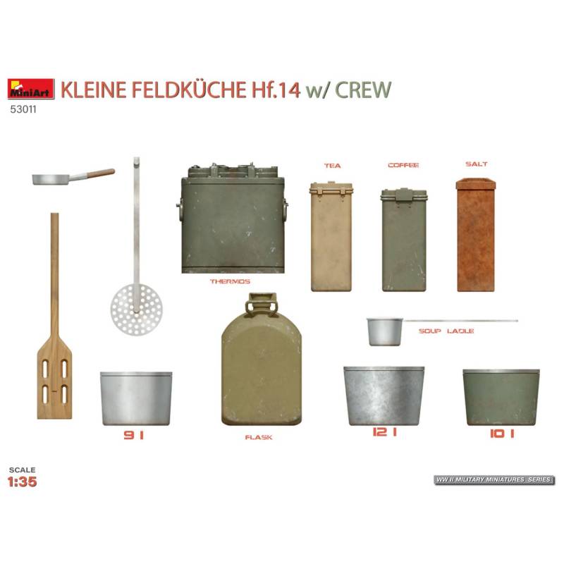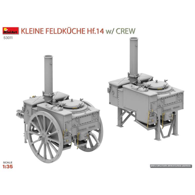 Le kit MiniArt 53011 reproduit fidèlement cette version classique de la Hf.14, accompagnée d’un ensemble complet d’accessoires et de figurines, permettant de recréer une scène réaliste de pause ou de préparation du repas :