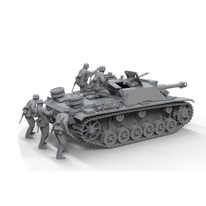 Le set BORDER MODEL BR-005 représente un groupe de fantassins allemands embarqués sur char (Tank Desant Troops) de la Seconde Guerre mondiale, une scène emblématique des combats sur le front de l’Est. Ces soldats, souvent transportés sur les blindés ou les canons d’assaut, accompagnaient les véhicules pour assurer une protection rapprochée contre l’infanterie ennemie et les menaces antichars.